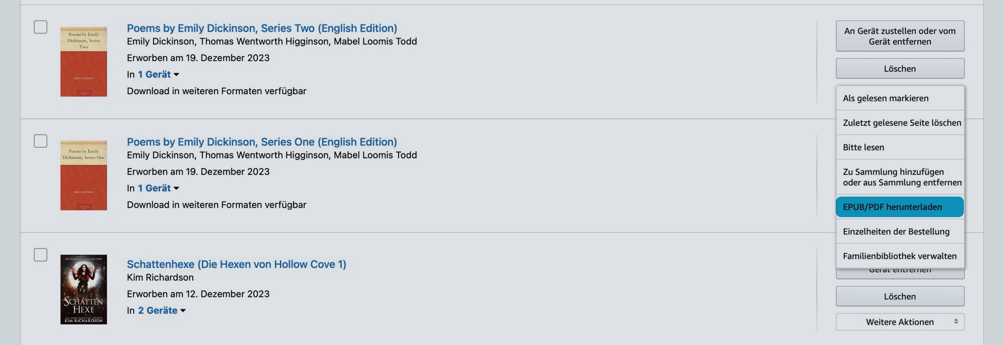 Para descargar un libro electrónico, selecciónelo en "Contenido digital" en su cuenta de Amazon. Si existe una versión sin DRM, aparecerá la opción "Descargar EPUB/PDF" en "Más acciones". Esto permite leer el libro en eReaders sin la aplicación Kindle. Vender sin DRM también significa que, en teoría, los libros pueden compartirse con amigos, razón por la cual Amazon está dando a los editores la opción de ofrecer sus libros con o sin DRM.