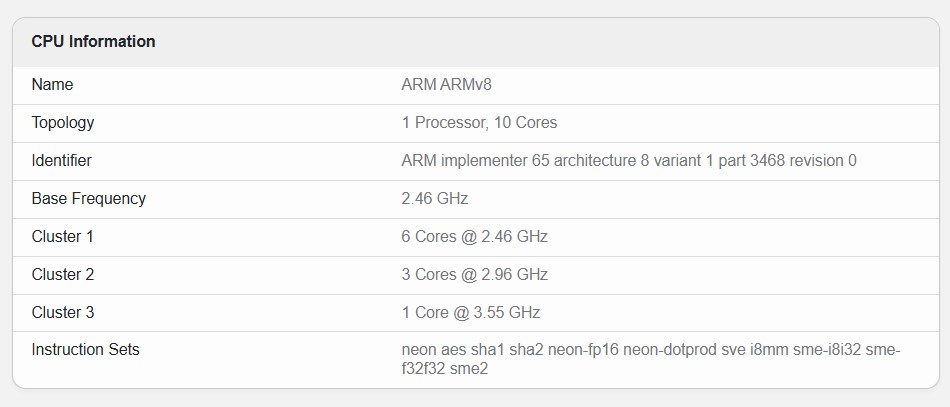 Dicho esto, hay una clara razón técnica para la caída de las puntuaciones: un cambio en la configuración de pruebas del chip. La última entrada de Geekbench muestra que el Exynos 2600 se probó con frecuencias de CPU significativamente reducidas en comparación con versiones anteriores. Anteriormente, el chip funcionaba con 6 núcleos a 2,76 GHz, 3 núcleos a 3,26 GHz y 1 núcleo a 3,80 GHz. Mientras tanto, las nuevas pruebas muestran una configuración de la CPU con 6x núcleos a 2,46 GHz, 3x núcleos a 2,96 GHz y 1x núcleo a 3,55 GHz.