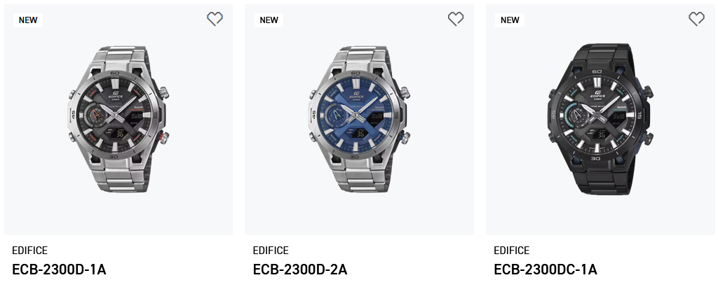 Casio ha añadido tres referencias Edifice Sospensione ECB-2300 a su sitio web internacional: ECB-2300D-1A, ECB-2300D-2A, y ECB-2300DC-1A, lo que indica un mayor despliegue fuera de Japón. Las páginas de producto dedicadas a los modelos inoxidables (D-1A, D-2A) y a la versión de iones negros (DC-1A) ya están activas en el sitio global