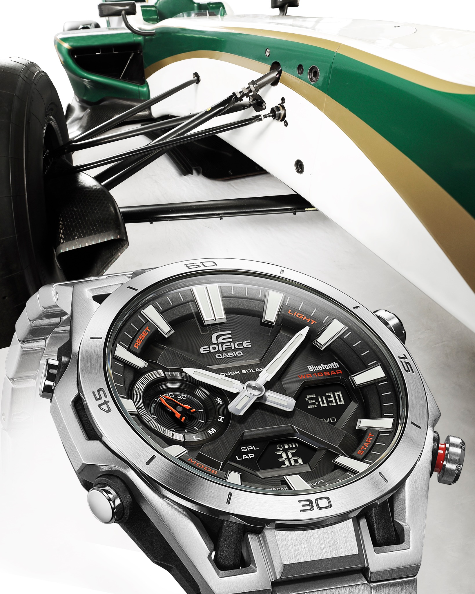 Cada uno de los relojes Edifice tiene una ligera carcasa de resina reforzada con fibra de carbono y acero inoxidable, mide 50,2 x 45,8 x 10,9 mm (~2,0 x 1,8 x 0,4 pulgadas) y pesa 122 g (4,3 oz). Cuenta con asas en forma de brazo, imitando la suspensión de doble horquilla que se ve en algunos coches de carreras de Fórmula. Además, estos relojes vienen con una correa de acero inoxidable y son resistentes al agua hasta 10 bares. Entre las características de estos relojes Casio se incluyen la conectividad Bluetooth, la compatibilidad con la hora mundial y la carga Tough Solar. También ofrecen un cronómetro, un temporizador y múltiples alarmas. Además, la hora se muestra tanto en la esfera analógica como en las pantallas digitales insertables, que también pueden mostrar la fecha y el día de la semana.