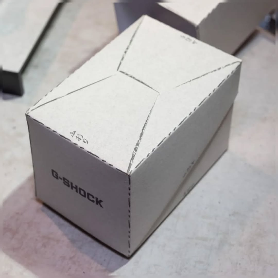 En el DW-5600RGM-1, las líneas de puntada impresas trazan los bordes de la caja y los segmentos de la banda como guías de corte y plegado, con un arte de "perforación" punteado alrededor del bisel que debería verse nítido bajo la dura iluminación de las exposiciones. La impresión monocroma evita el sangrado en los bordes y mantiene intactas las proporciones del cuadrado, por lo que el diseño es principalmente gráfico. Por otro lado, el DW-6900RGM-5 invierte completamente la paleta: la resina blanca se convierte en una base para los gráficos de punto gris que acentúan el bisel en capas y los recortes de triple ojo del 6900, y la alineación de la impresión a lo largo de los guardacorreas y las asas parece bastante ajustada. La retroiluminación EL de ambos modelos tiene la silueta de una grulla, algo que también es visible en el fondo de la caja y en el embalaje, lo que conecta los gráficos exteriores con el tema del "origami" en lugar de dejarlo como decoración sólo superficial.