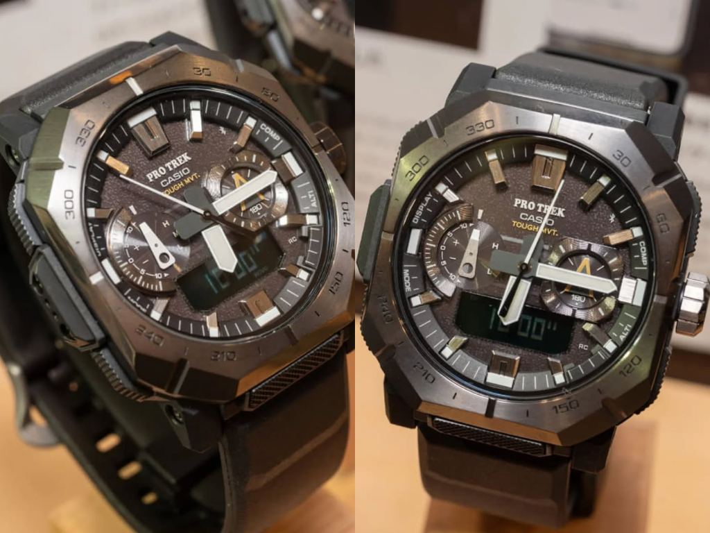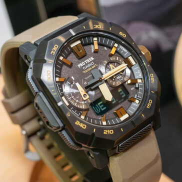 Incluso en estas imágenes IRL, la esfera híbrida analógica/digital del PRW-B1000 es visible, con indicaciones claras para las funciones de brújula, termómetro y barómetro, todas ellas parte del conjunto establecido de triple sensor de Casio. El material oficial también confirma la conectividad Bluetooth de la aplicación y la carga solar. El reloj tiene cronometraje atómico (Multi-Band 6) y un tamaño de caja que mide aproximadamente 50,8 x 48,5 x 14,9 mm.
