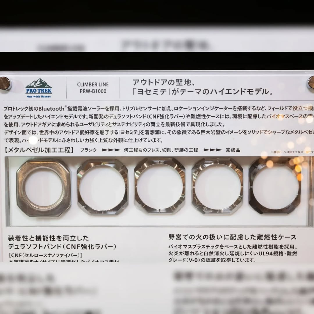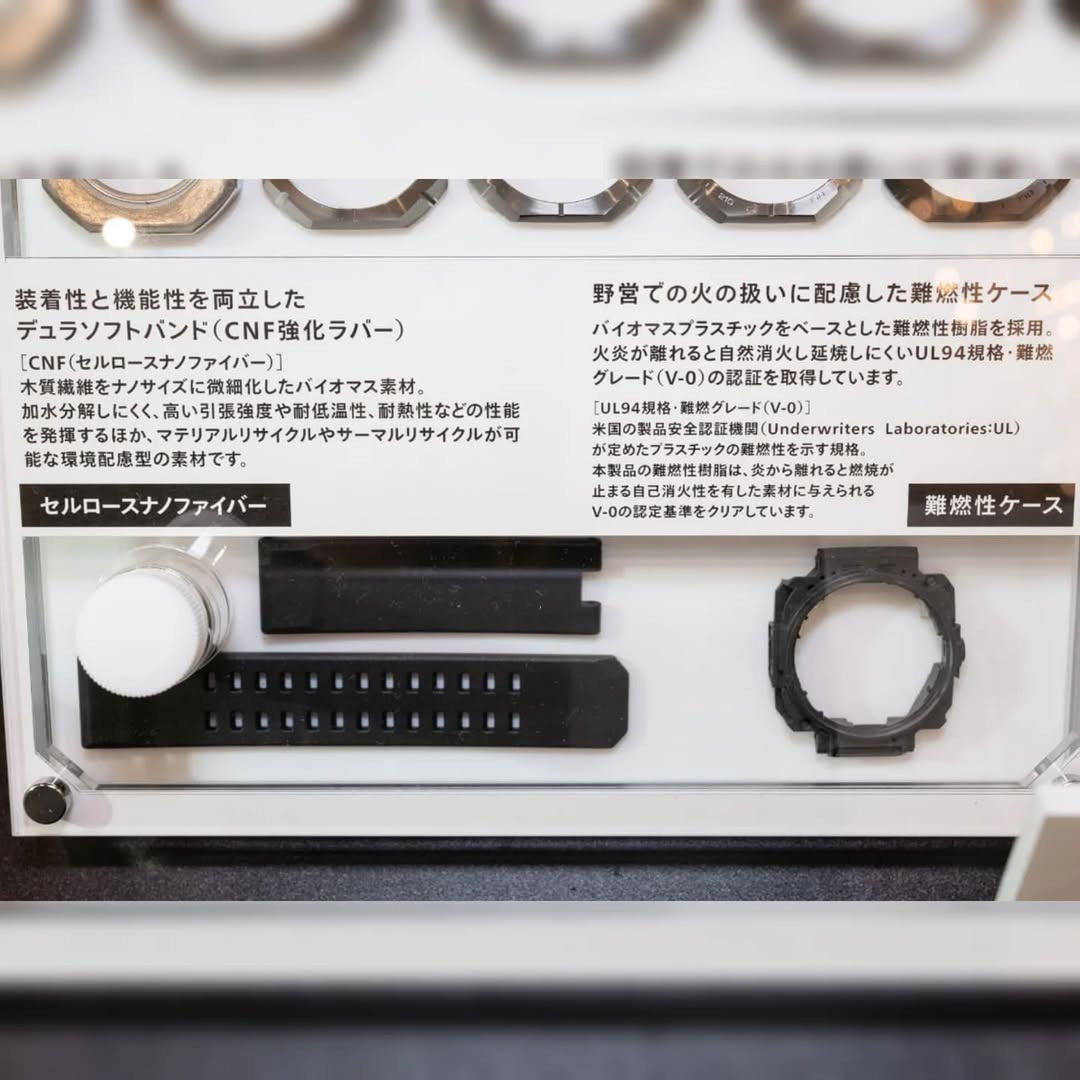 La vitrina también revela el uso por parte de Casio de caucho reforzado con nanofibras de celulosa (CNF) para la correa, que ofrece una mayor resistencia al desgaste y una integración bioplástica respetuosa con el medio ambiente. Un texto dedicado en la pantalla destaca la certificación ignífuga de la correa y la carcasa del reloj, conseguida mediante el uso de materiales de grado UL94 V-0, importante para un uso seguro en el campo.