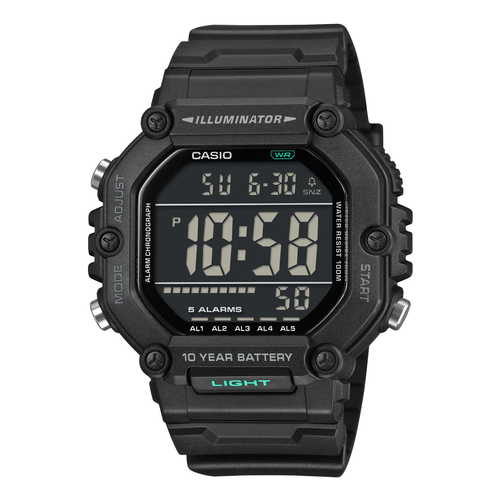 Lo más probable es que el mayor argumento de venta de la serie AE-1600HX sea su supuesta pila de 10 años de duración, gracias a una pila CR2032. También tiene una resistencia al agua de 100 metros, lo que ya lo acerca a los típicos relojes deportivos básicos de Casio. Además, el AE-1600HX-1BV luce una pantalla en negativo - el diseño totalmente negro suele ser más popular entre los compradores.