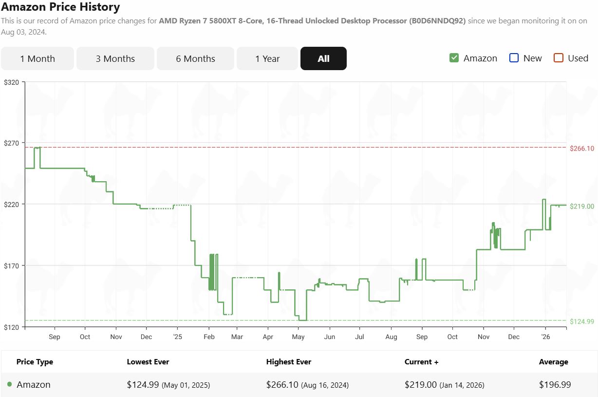 Lo mismo ha ocurrido con el Ryzen 7 5800XT de 8 núcleos. La CPU está actualmente a 219 dólares en Amazon. Allá por mayo de 2025, la CPU alcanzó su precio mínimo histórico de 125 dólares, por lo que el precio actual es más de un 75% superior.