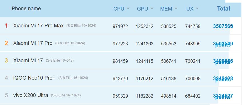 La última tabla de rendimiento de AnTuTu así lo pone de manifiesto. El Xiaomi 17 aparece con una puntuación de CPU de 981.459 en la tabla oficial. Impresionante de por sí, pero sólo un 3% superior a la del Vivo X200 Ultra consigue (959.329), a pesar de que ese teléfono está alimentado por el Snapdragon 8 Elite del año pasado. Tanto el Xiaomi 17 Pro como el Xiaomi 17 Pro Max obtienen una puntuación aún más baja que el Xiaomi 17 vainilla.