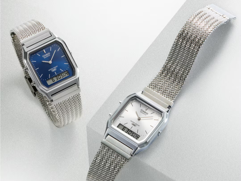 Esta entrega incluye dos versiones: la con esfera azul marino AQ230EM-2A y el con esfera plateada AQ230EM-7A. Ambos tienen la familiar disposición cuadrada, con manecillas analógicas en la parte superior y una lectura digital metida en el tercio inferior. Esta configuración ha permanecido casi intacta desde los años 90, pero la correa de malla le da un toque más pulido.
