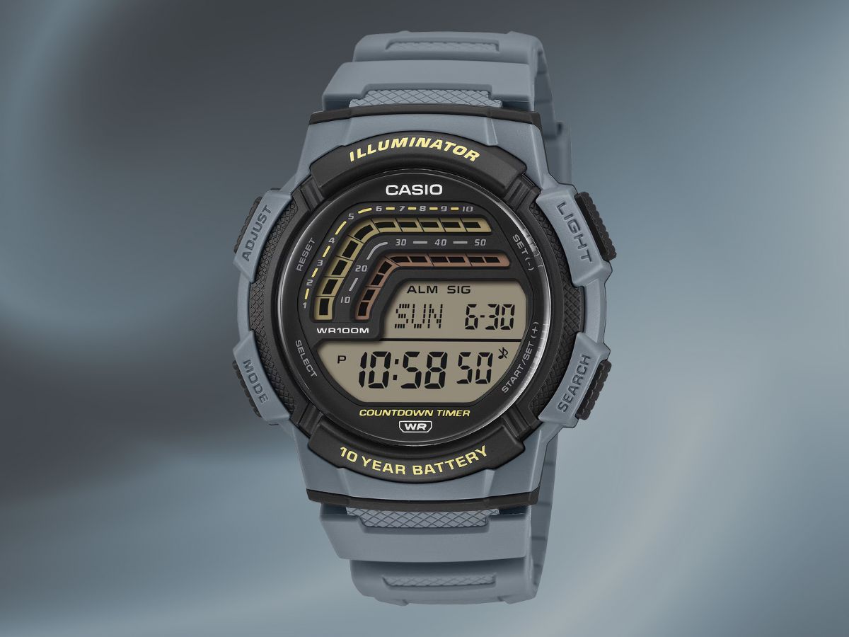 El Casio WS1800 se describe como un reloj digital multifunción con una "gran pantalla gráfica de estilo retro". En la parte superior de la esfera del reloj hay dos escalas que, según se dice, facilitan la lectura del temporizador de cuenta atrás o del cronómetro. Debajo hay una gran pantalla de fondo claro, que muestra la hora, la fecha y el día de la semana.