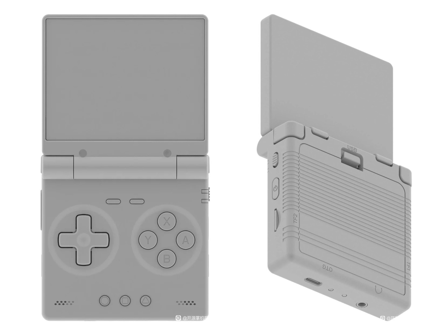 Los renders muestran un clamshell de Miyoo con batería extraíble y características TrimUI