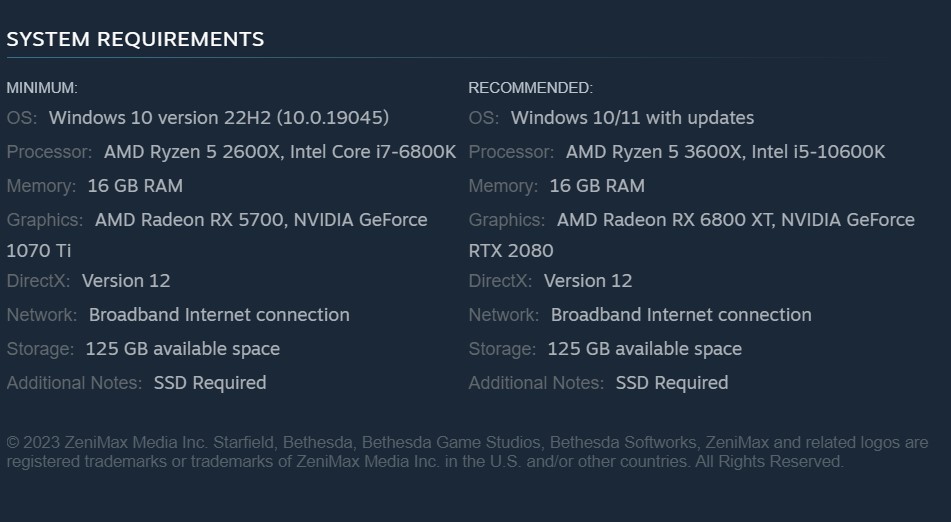 Según la página de Steam de Starfield, los requisitos mínimos de hardware del juego incluyen un Ryzen 5 2600X o una CPU Intel Core i7-6800K, 16 GB de RAM, una RX 5700 o una GeForce GTX 1070 Ti DirectX 12 y 128 GB de almacenamiento SSD. Los requisitos recomendados incluyen la misma configuración de RAM y memoria, pero aumentan los requisitos de CPU y GPU a AMD Ryzen 5 3600X/Intel i5-10600K y RX 6800 XT/GeForce RTX 2080 respectivamente.