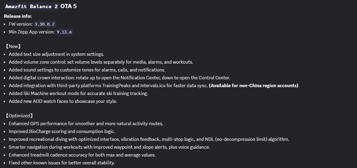 Amazfit ha anunciado en https://discord.com/channels/1202787457456799784/1258191692293476432 una nueva actualización para el smartwatch Balance 2. La versión de software 3.30.0.2, también conocida como la actualización Amazfit Balance 2 OTA 5, llega aproximadamente un mes después de la versión 3.24.6.2. Esta versión anterior añadía compatibilidad con el accesorio Stryd y solucionaba un problema con la función BioCharge.