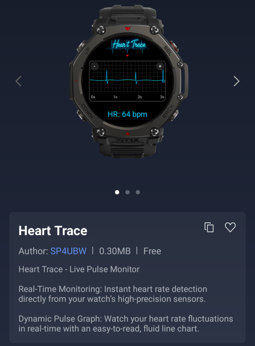 La más popular de las tres Mini Apps es Heart Trace, actualmente en segunda posición en la lista de las 50 aplicaciones más descargadas de Zepp OS Weekly. Se trata de un monitor de pulso en directo, que permite a los usuarios ver en tiempo real los datos de frecuencia cardiaca recogidos por su smartwatch. Las mediciones se muestran en un gráfico de pulso dinámico, que el desarrollador describe como "un gráfico de líneas fluido y fácil de leer".