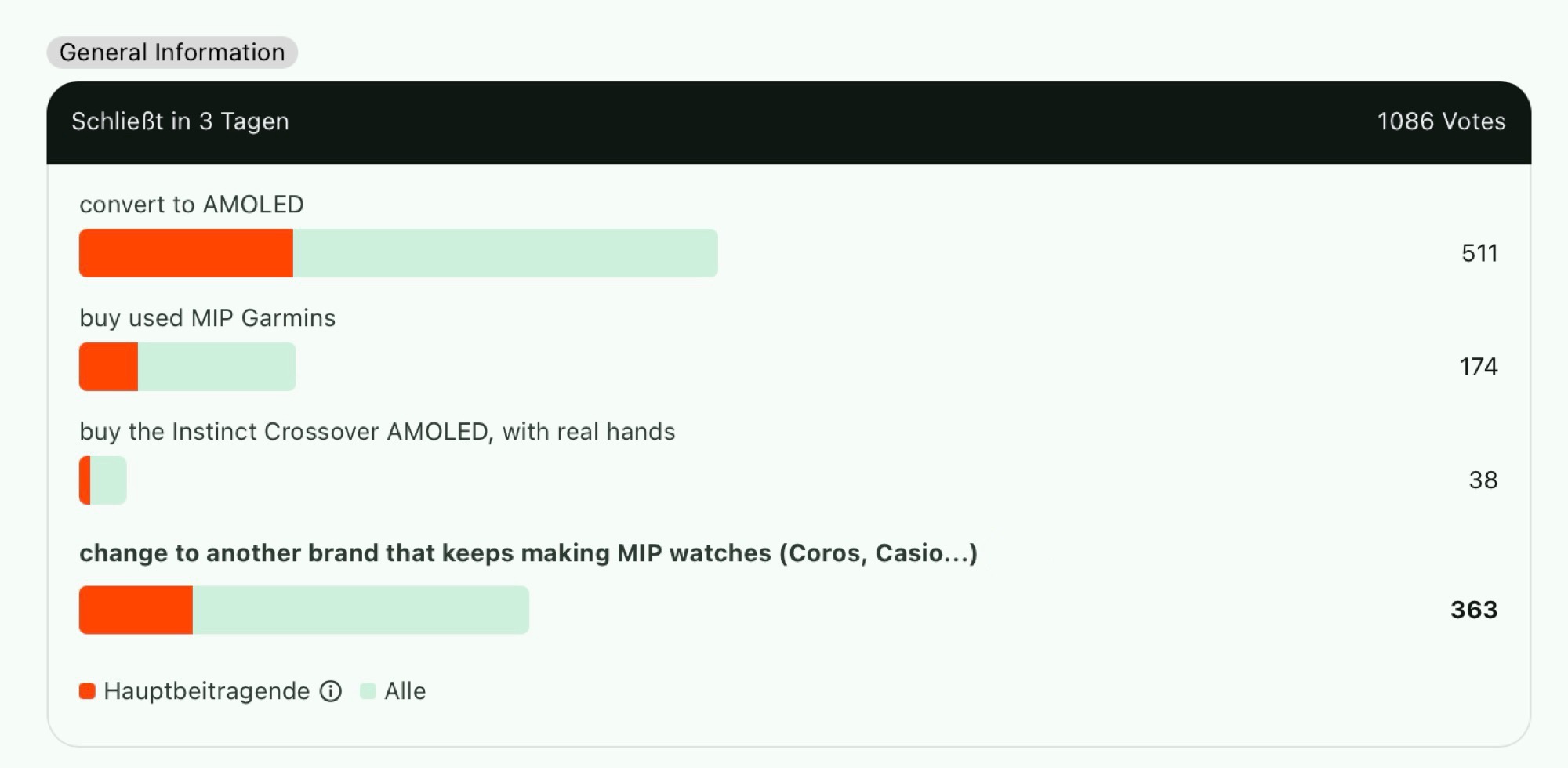 Una encuesta en Reddit muestra que de 1.086 encuestados, un total de 537 clientes comprarían un modelo más antiguo con pantalla MiP o cambiarían a otra marca si Garmin renunciara a la MiP. Sólo 511 clientes se plantearían cambiar a un modelo con panel AMOLED. 38 encuestados optarían en cambio por el Instinct Crossover, que combina un panel AMOLED con agujas de reloj