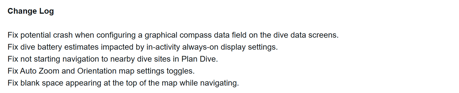 La actualización de la versión 19.50 aporta una serie de correcciones de errores a estos wearables. En primer lugar, Garmin ha solucionado un posible problema de bloqueo que se producía cuando los usuarios intentaban configurar el campo de datos de la brújula gráfica situado en las páginas de datos de inmersión. Algunos usuarios del ordenador de buceo Descent Mk3 han visto un espacio en blanco cerca de la parte superior del mapa al navegar; este problema se ha resuelto. En las notas de la versión se indica que se ha rectificado una imprecisión con las estimaciones de la batería de inmersión, relacionada con el modo de pantalla siempre activa.