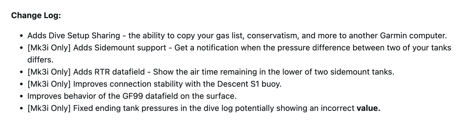 Los smartwatches Garmin Descent Mk3 y Mk3i obtienen una nueva función para compartir la configuración de inmersión con la versión 25.21. Esto permite a los usuarios copiar información como su lista de gases y su conservadurismo a otro dispositivo Garmin. Ambos aparatos también ven mejorados los datos del Factor de Gradiente 99% (GF99) que se muestran cuando están en la superficie.
