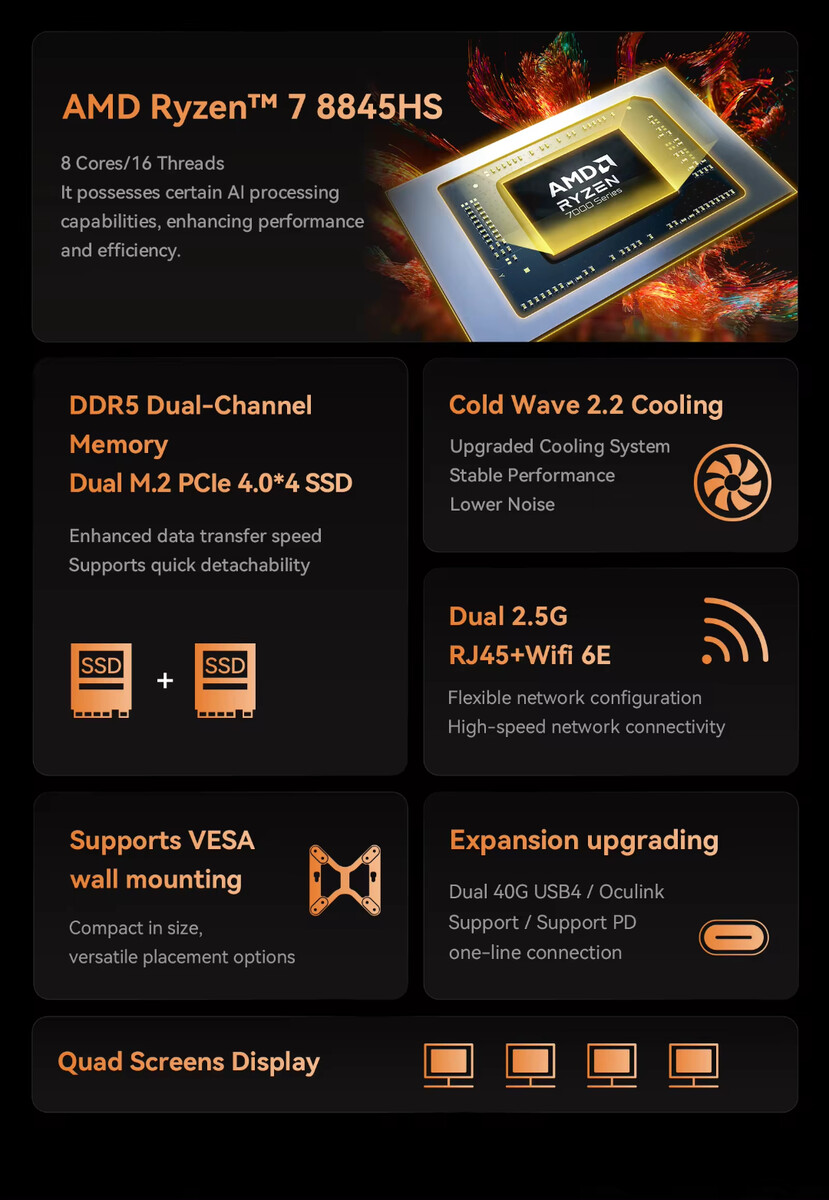 Para contextualizar, MINISFORUM dio el mismo tratamiento al UM890 Pro a finales de junio. Esta vez, es el turno del UM880 Pro, que por el momento vende en exclusiva a través de AliExpress. Aunque el UM880 Pro no puede configurarse con el mismo AMD Ryzen 9 8945HS APU que el UM890 Pro, MINISFORUM ofrece el primero en su lugar con el ligeramente menos potente Ryzen 7 8845HS con un descuento adicional.