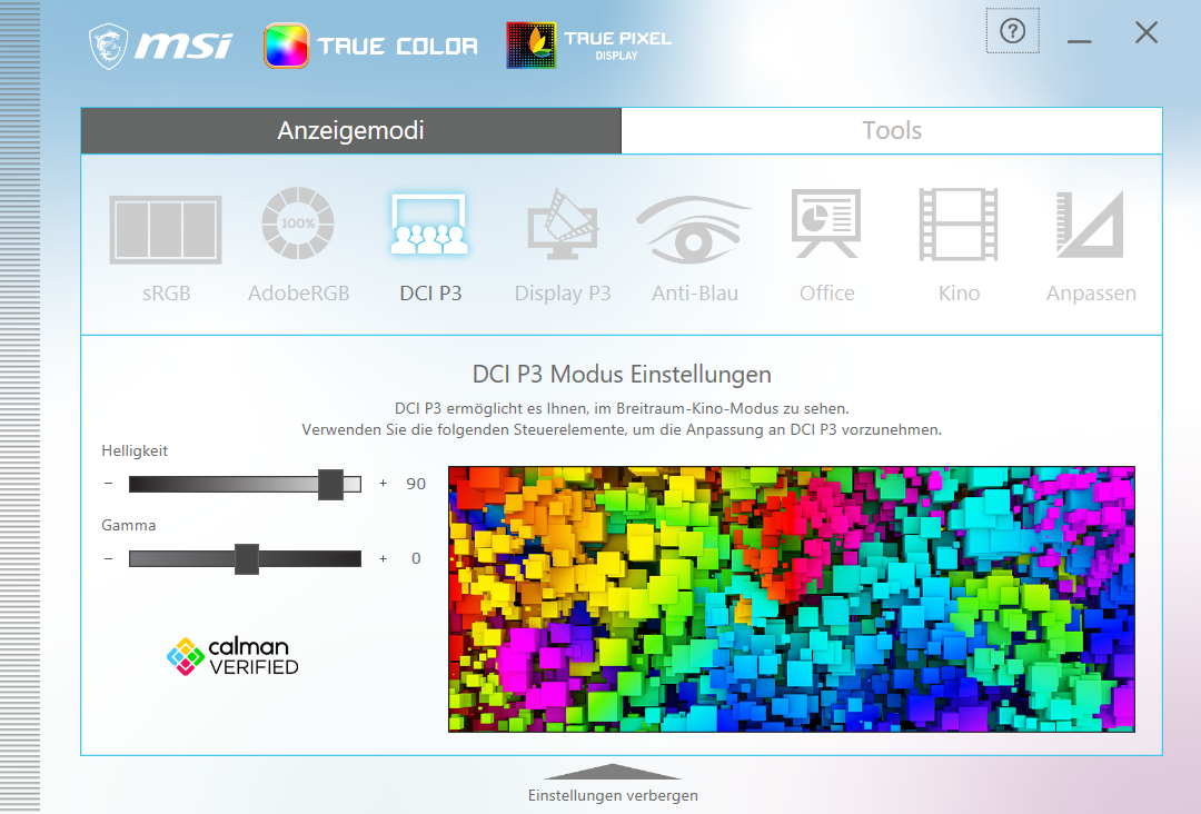 La pantalla calibrada de fábrica cubre completamente el espacio de color DCI-P3. Sin embargo, este espacio ampliado no siempre es necesario y puede ser molesto, por ejemplo en el uso de Office con Outlook y Excel. Aquí es donde entra en juego MSI True Color. Allí se puede seleccionar el modo de visualización que se ajuste al escenario. Los programas se pueden asignar con App Sync. Así, el perfil de color correspondiente se activa automáticamente la próxima vez que se inicie Photoshop.