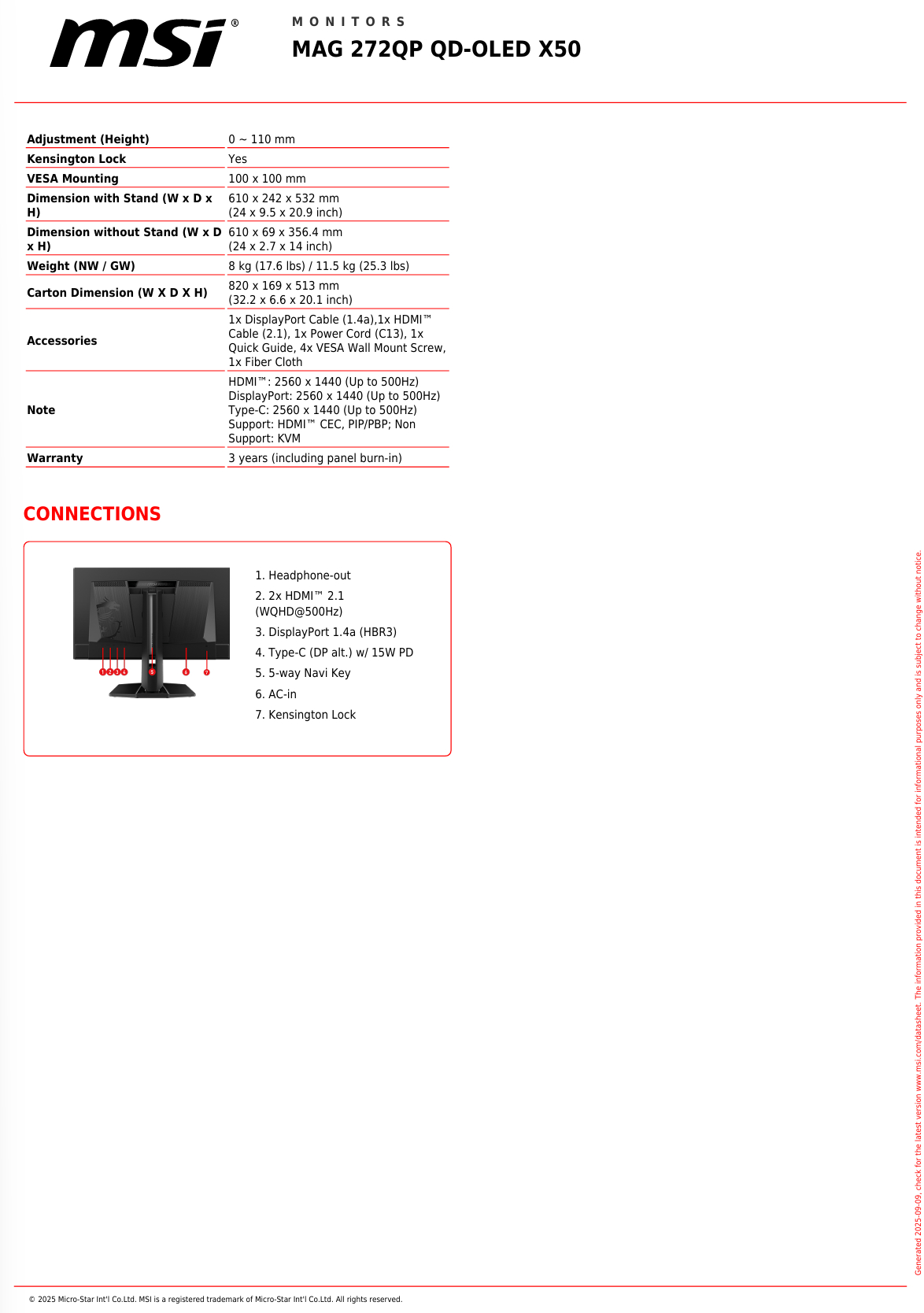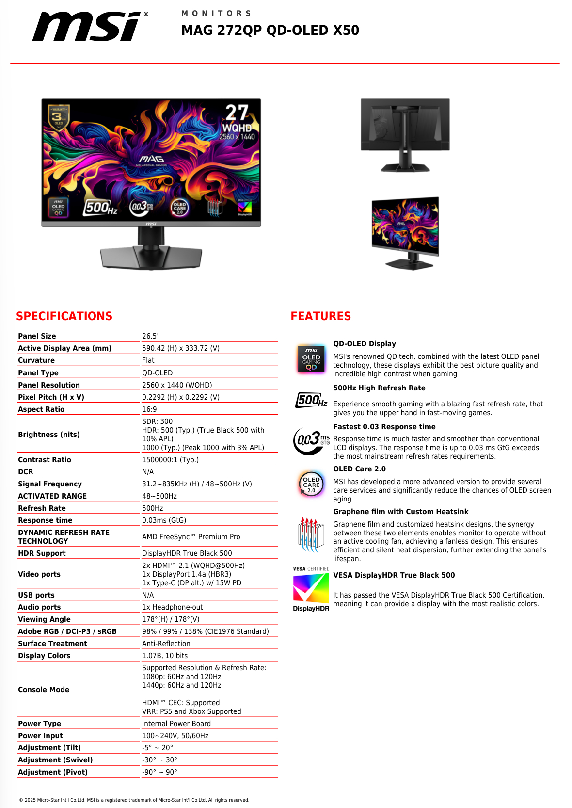 Actualmente, el MAG 272QP X50 está disponible por 749,99 dólares en Amazon US, Best Buy y Newegg o MSI directamente. En el momento de la publicación, todos los minoristas deberían empezar a enviar el nuevo monitor de 500 Hz de MSI a mediados de mes. Consulte el sitio web de MSI y la hoja de datos que figura a continuación para obtener más detalles sobre el hardware.