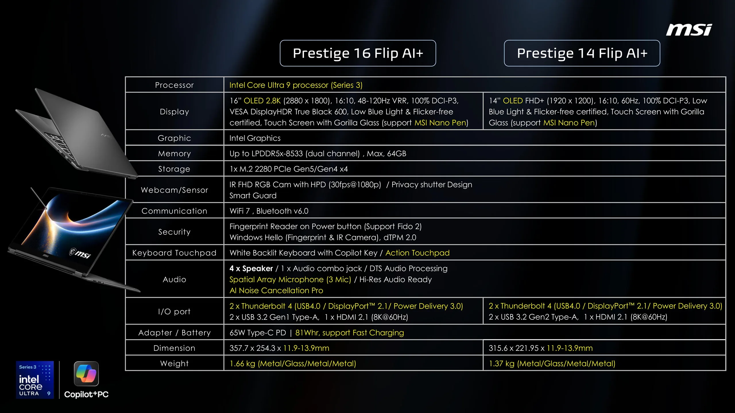 Los precios parten de 1.399 dólares para el Prestige 16 AI+ y de 1.629 dólares para el Prestige 16 Flip AI+ con CPU Core Ultra X9. La variante Core Ultra 7 de la Prestige 16 Flip AI+ se venderá a un precio inicial de 1.549 dólares.