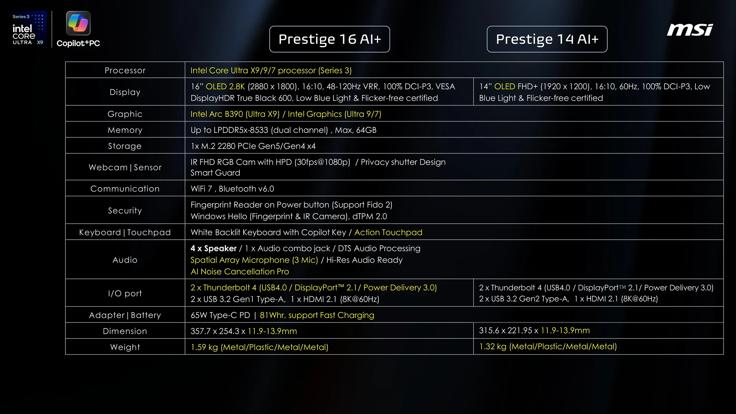 MSI ofrecía anteriormente la Prestige 16 en dos sabores: una Prestige 16 AI Evo impulsado por el Intel Arrow Lake-H Core Ultra 9 285H y un Prestige 16 AI+ Mercedes-AMG Edición Limitada con el procesador Intel Lunar Lake Core Ultra 9 288V.