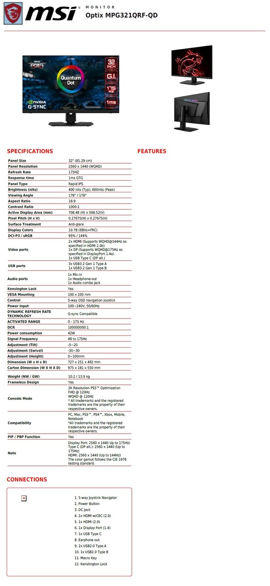 Por último, el MSI Optix MPG321QRF-QD ofrece la mayor tasa de refresco, 175 Hz, pero también la menor resolución, 2560x1440. El modo consola ofrece juegos FHD y WQHD a 120 Hz en el PS5, y el HDMI 2.0b soporta WQHD a 144 Hz (DisplayPort 1.4a para 175 Hz). El monitor IPS de 32 pulgadas es, al igual que los otros dos modelos, compatible con Nvidia G-Sync, y consigue un tiempo de respuesta de gris a gris de 1 ms.
