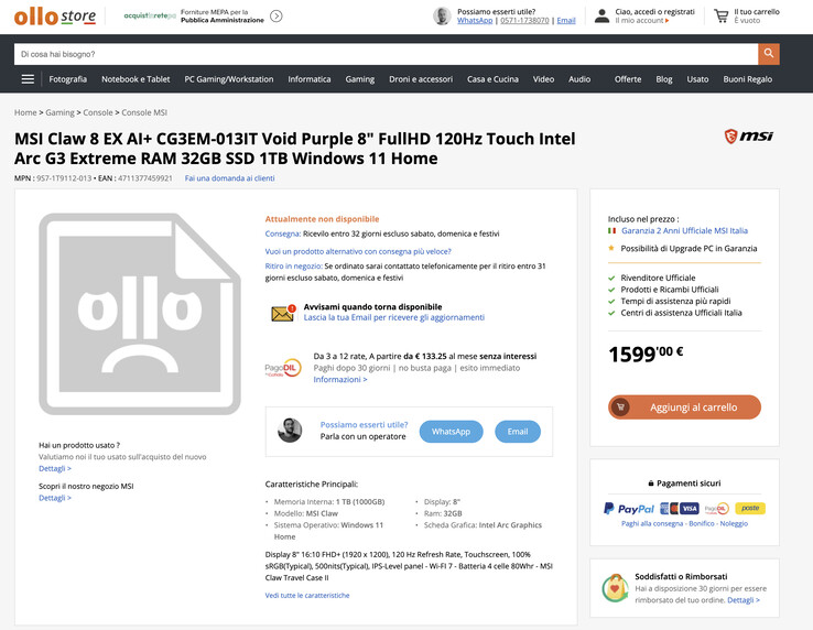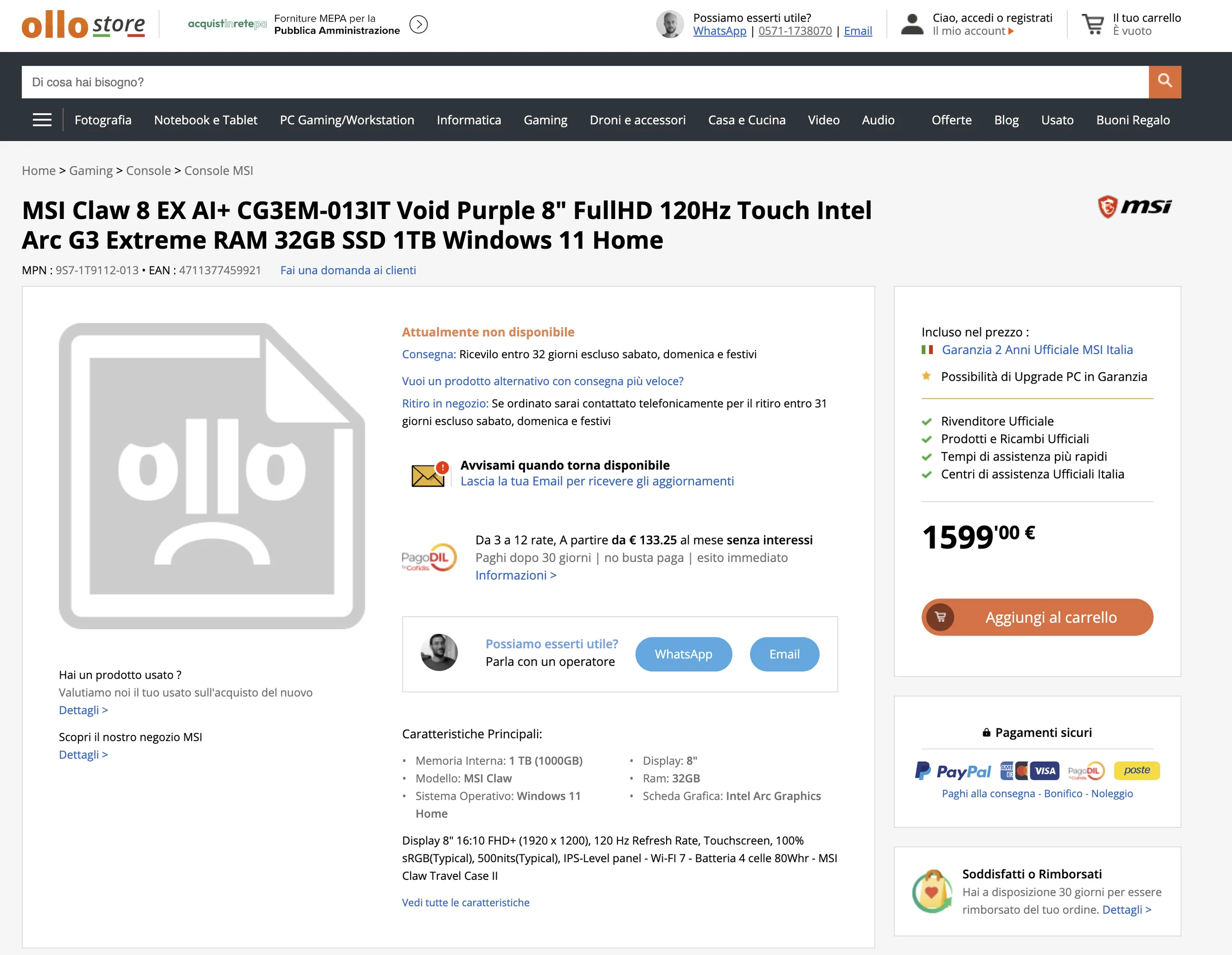Un minorista italiano acaba de revelado información sobre los precios de la esperada actualización Glacier Blue del Claw 8 AI+ de MSI. Al mismo tiempo, Ollo Store ha compartido información inicial sobre el Claw 8 EX AI+, pruebas que hemos incrustado a continuación.