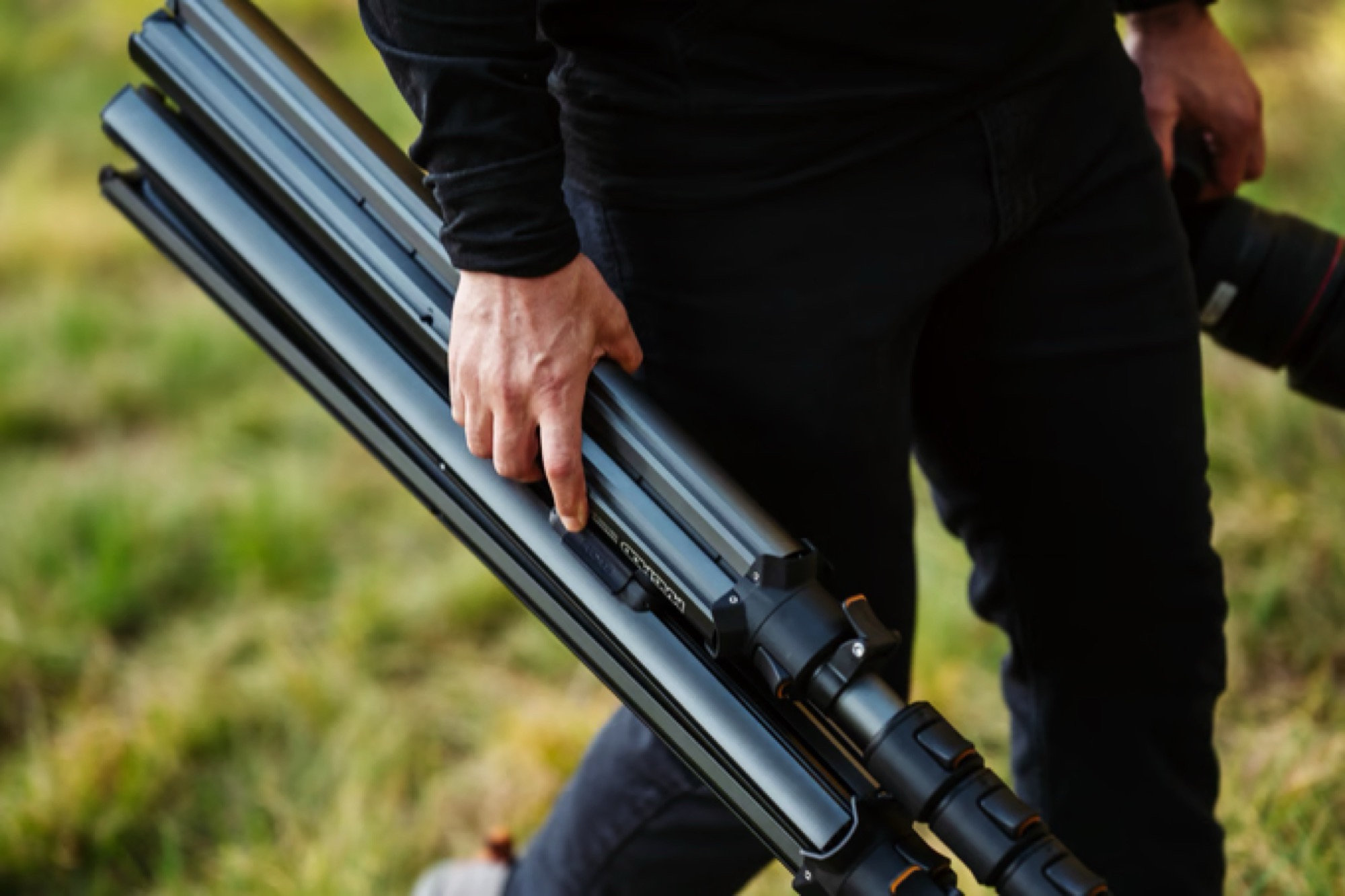 Comienza con la columna central, que puede desbloquearse mediante dos botones situados al final de cada segmento y se bloquea automáticamente en su sitio cuando se sueltan dichos botones. Eso hace que los ajustes de altura sean mucho más rápidos en comparación con un collar de rosca o un flip lock. La columna central puede intercambiarse para cambiar la altura máxima, y MagMod ofrece versiones con una altura máxima de 9 u 11 pies. Las patas pueden extenderse con un sistema de bloqueo similar.
