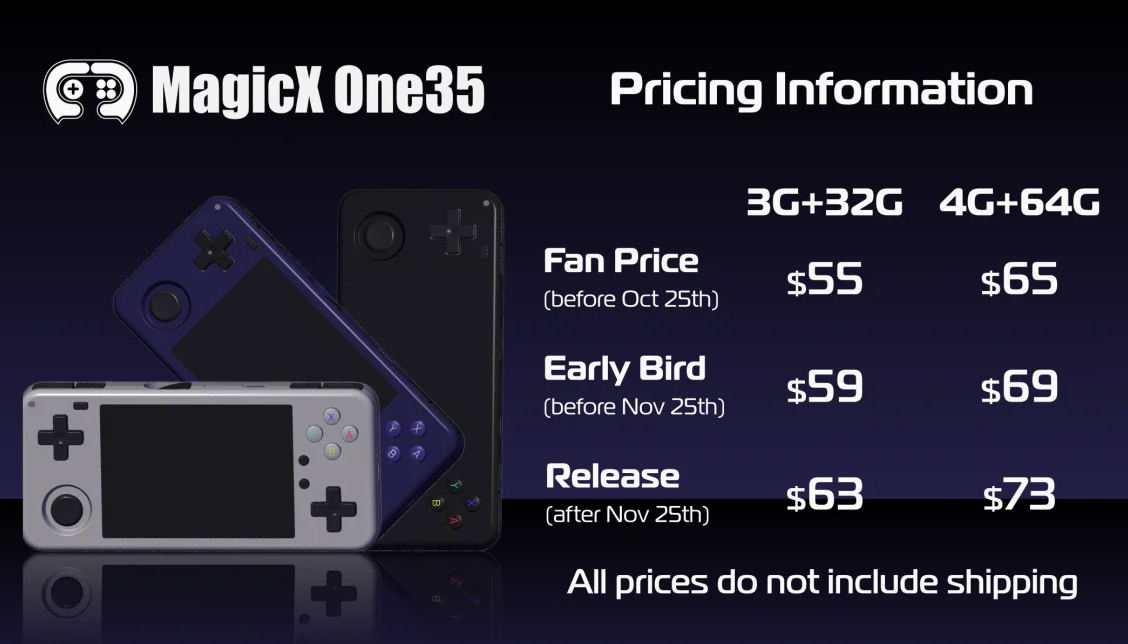 Actualmente, el One 35 puede recogerse en el sitio web de MagicX por 55 dólares con 3 GB de RAM y 32 GB de almacenamiento. Sin embargo, este precio sólo es válido hasta el 25 de octubre, después de lo cual el One 35 comenzará a costar 59 dólares antes de subir a 63 dólares el 25 de noviembre. Alternativamente, el One 35 puede configurarse con 4 GB de RAM y 64 GB de almacenamiento por 65 dólares, 69 dólares entre el 25 de octubre y el 25 de noviembre y 73 dólares después del 25 de noviembre. Independientemente del precio, el MagicX One 35 debería empezar a enviarse globalmente el 26 de noviembre.