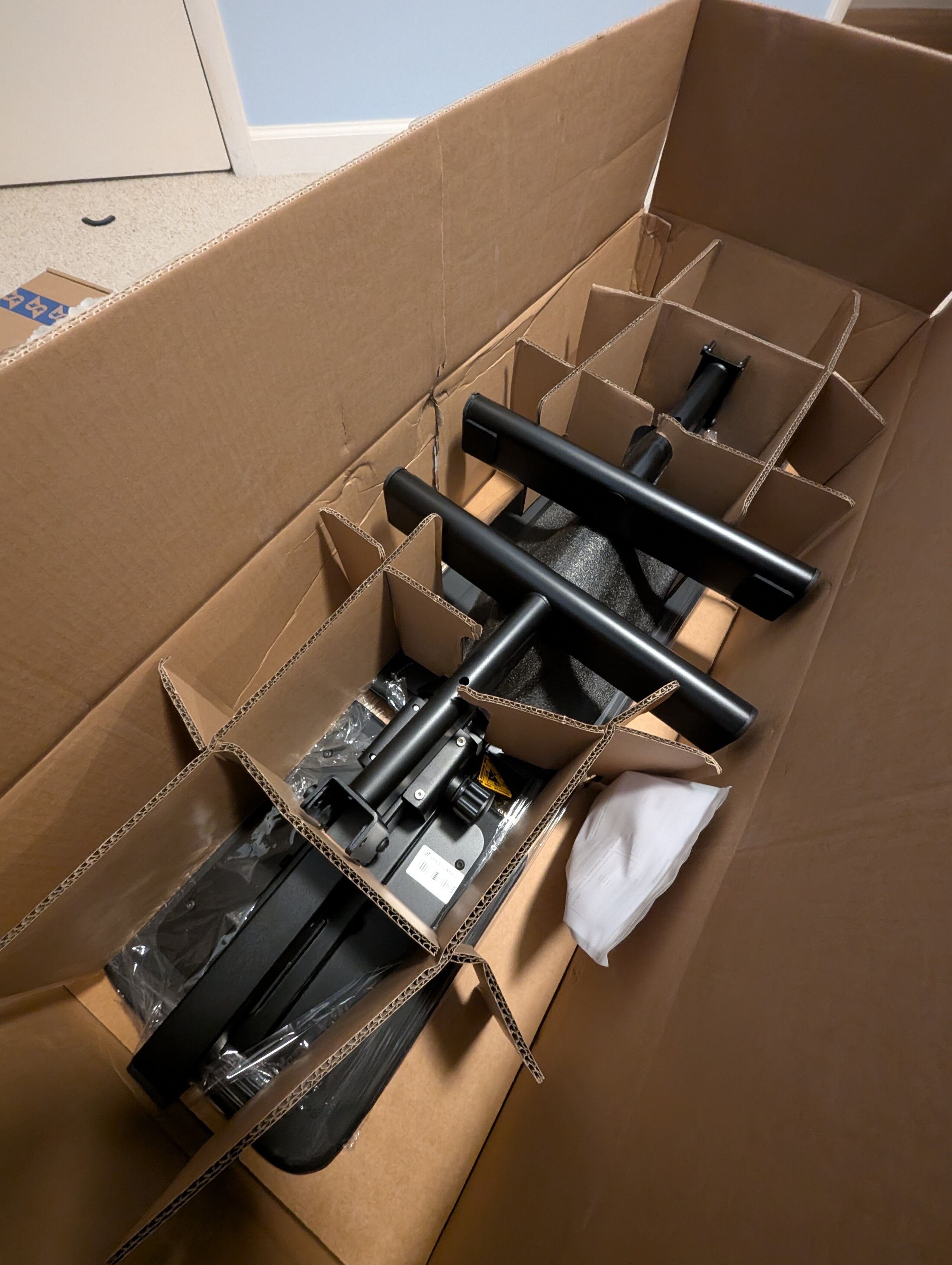 La caja del Gym Monster 2 es enorme. Afortunadamente, esto se debe a que el GM2 se envía casi completamente montado. A pesar de lo poco manejable que pueda parecer la caja, ponerla de pie y desembalar la unidad fue manejable, aunque un entrenamiento en sí mismo. Además, el banco ajustable que forma parte del paquete "Works Plus" venía embalado en una segunda caja más pequeña.
