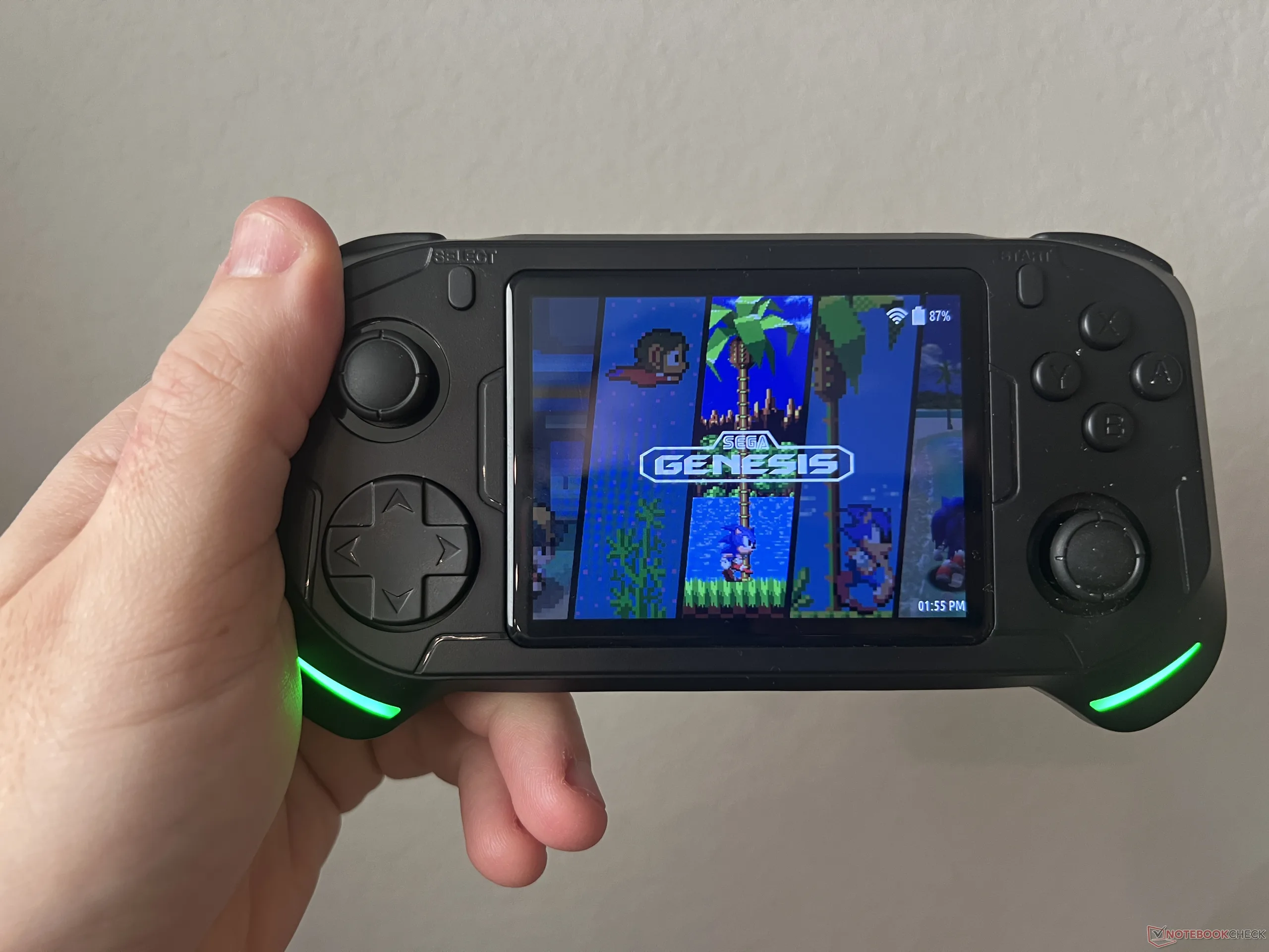 Hay dos tiras de LED verdes en la parte inferior de cada empuñadura para darle un poco de estilo. El color no se puede cambiar, pero se puede configurar para que sea tenue, brillante o de respiración. Hay dos altavoces integrados en la parte trasera, así como dos puertos USB-C (uno para cargar y otro para conectar un mando) y un conector de audio de 3,5 mm en la parte inferior. En la parte superior hay un puerto mini-HDMI para conectarlo a un televisor.