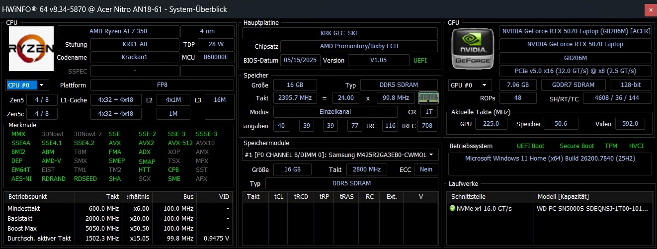 | Acer Nitro 18 AI AN18-61-R10V AMD Ryzen AI 7 350 ⎘ NVIDIA GeForce RTX 5070 Laptop ⎘ 16 GB Memoría, 1000 GB SSD | Precio de catálogo: 1900 EUR | 3 kg | 25 mm | 18.00" 2560x1600 168 PPI IPS | |