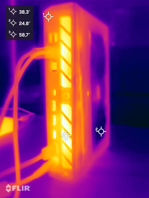 Las temperaturas de la carcasa de la Asus ROG NUC 15 se mantienen sin cambios. Algunas zonas se calientan más. Sin embargo, no se dan valores extremos. El Intel Core Ultra 9 275HX sólo alcanza brevemente los 80 °C, por lo que se mantiene agradablemente fresco. La GPU Nvidia GeForce RTX 5080 para portátiles funciona a una media de 77 °C con un consumo normal de 120 vatios.