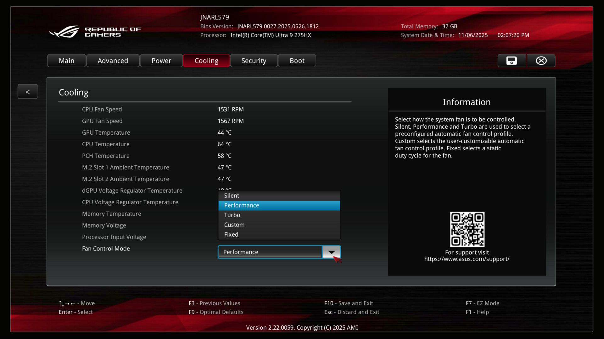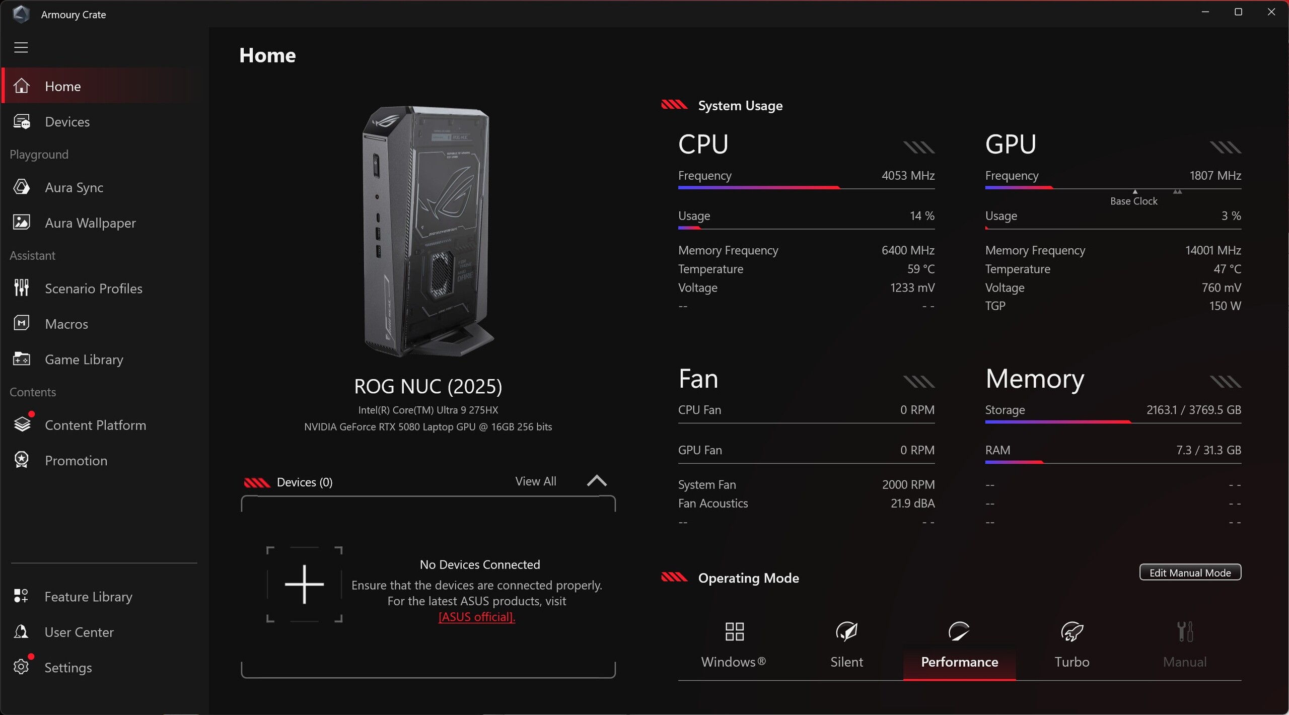Utilizamos el perfil de energía "Rendimiento" para todas las pruebas de rendimiento con este dispositivo. La UEFI ampliamente diseñada ofrece muchas posibilidades para personalizar el dispositivo. Se pueden seleccionar varios perfiles de rendimiento y perfiles de ventilador. El rendimiento también puede ajustarse fácilmente en el sistema operativo Windows mediante la conocida herramienta Armoury Crate.