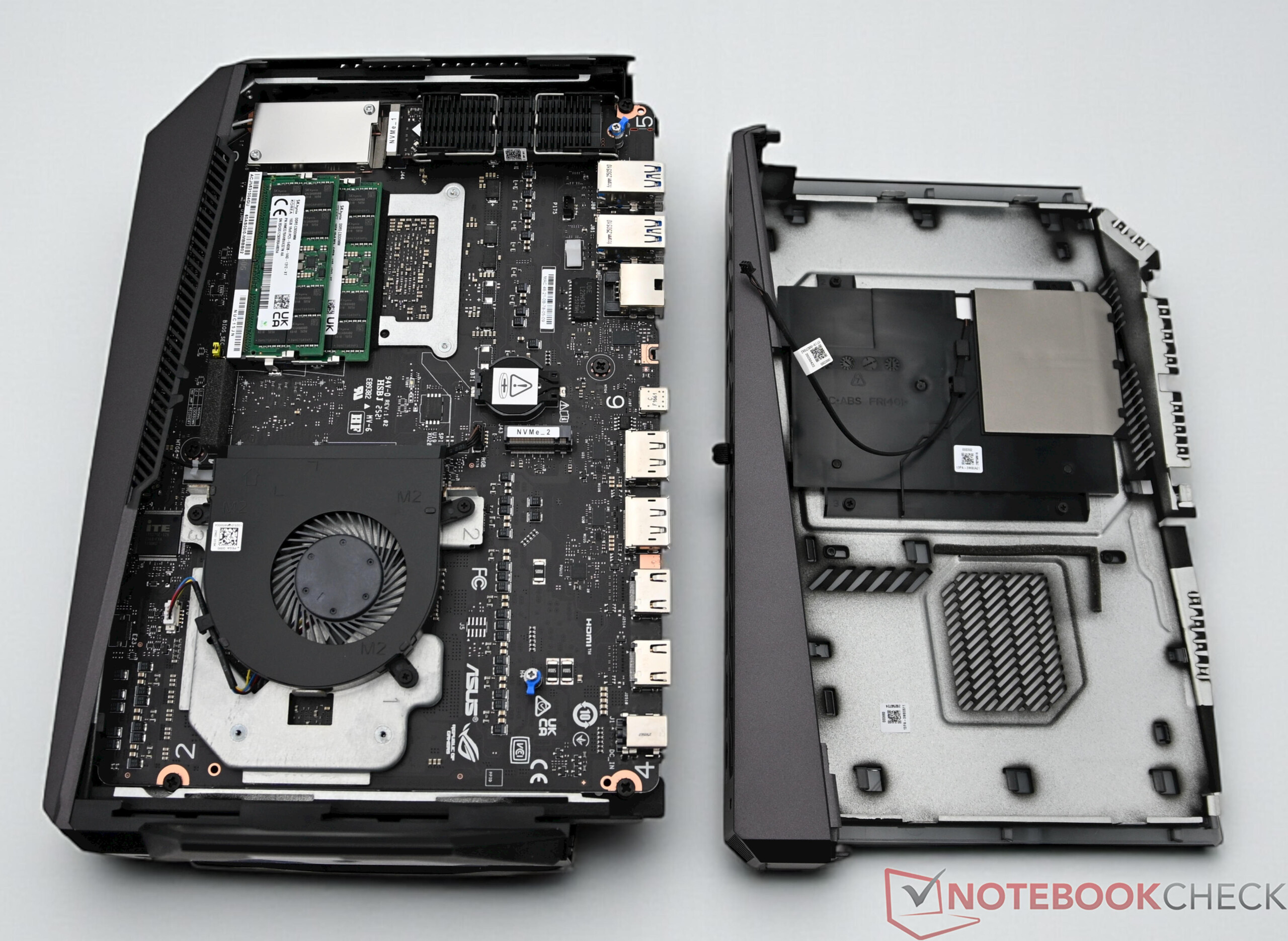 Las tareas de mantenimiento en el Asus ROG NUC 15 son posibles sin problemas. Asus prescinde de complicadas uniones atornilladas para que la RAM y la SSD sean de fácil acceso. Tras retirar el panel lateral, hay espacio para hasta dos SSD M.2. El módulo WLAN también puede sustituirse en caso necesario.