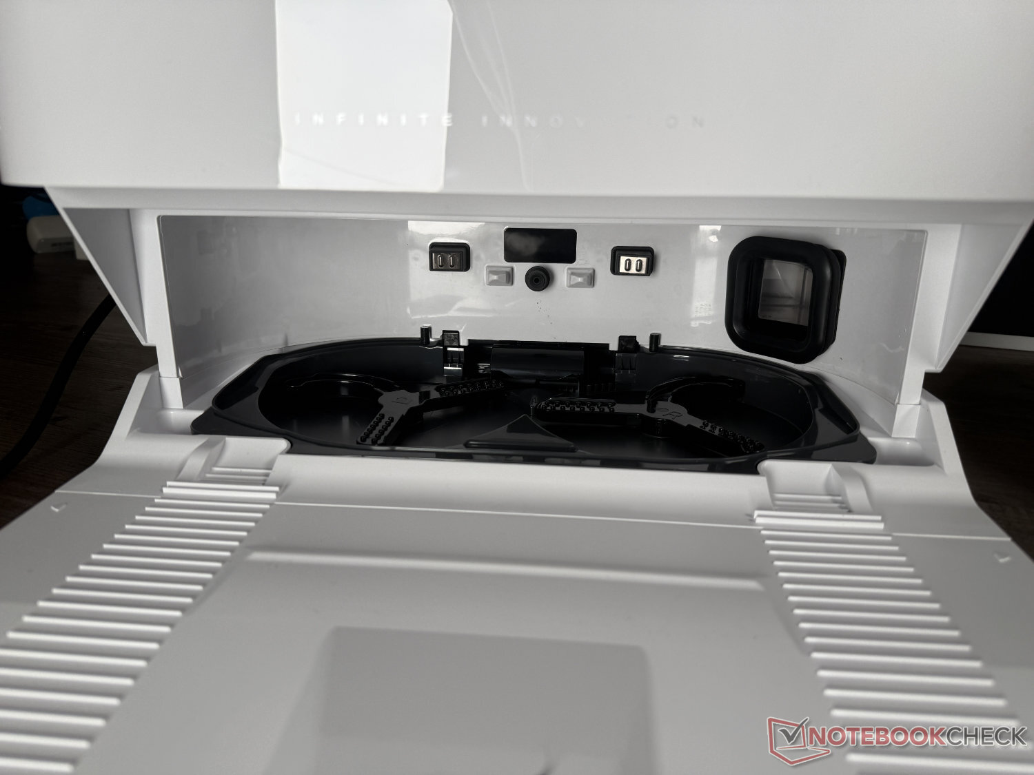 La Eureka J15 Max Ultra se suministra con una estación de autolimpieza. Además - aparte de la falta de dispensación automática de detergente - las mopas se limpian como de costumbre con agua calentada a 80°C y luego se secan con aire calentado a 55°C. Visualmente, la base tiene un diseño bastante sencillo y atractivo. Lo que empaña un poco el aspecto a nuestros ojos es que la versión blanca tiene un cable de alimentación negro.