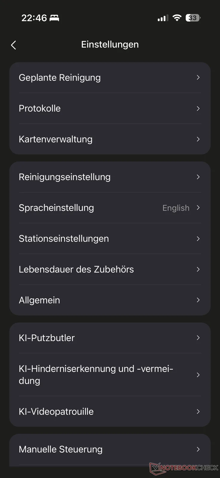 En el menú de la parte superior derecha aparecen numerosas opciones de ajuste. Además de la programación y los protocolos de limpieza, están las habituales e importantes opciones de personalización de la limpieza (incluidos los ajustes individuales para cada alfombra), la detección de obstáculos AI, la estación y mucho más. Nos irritó el hecho de que el acceso a la transmisión de vídeo en directo funcionara sin una activación previa que incluyera un código de seguridad. También echamos de menos el control por voz. Sólo hay una respuesta de voz en alemán.