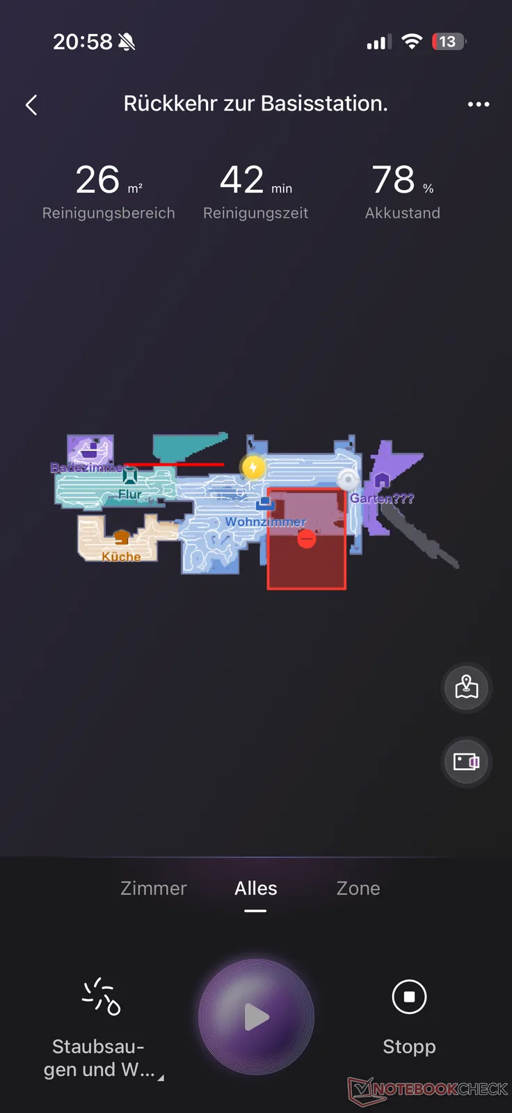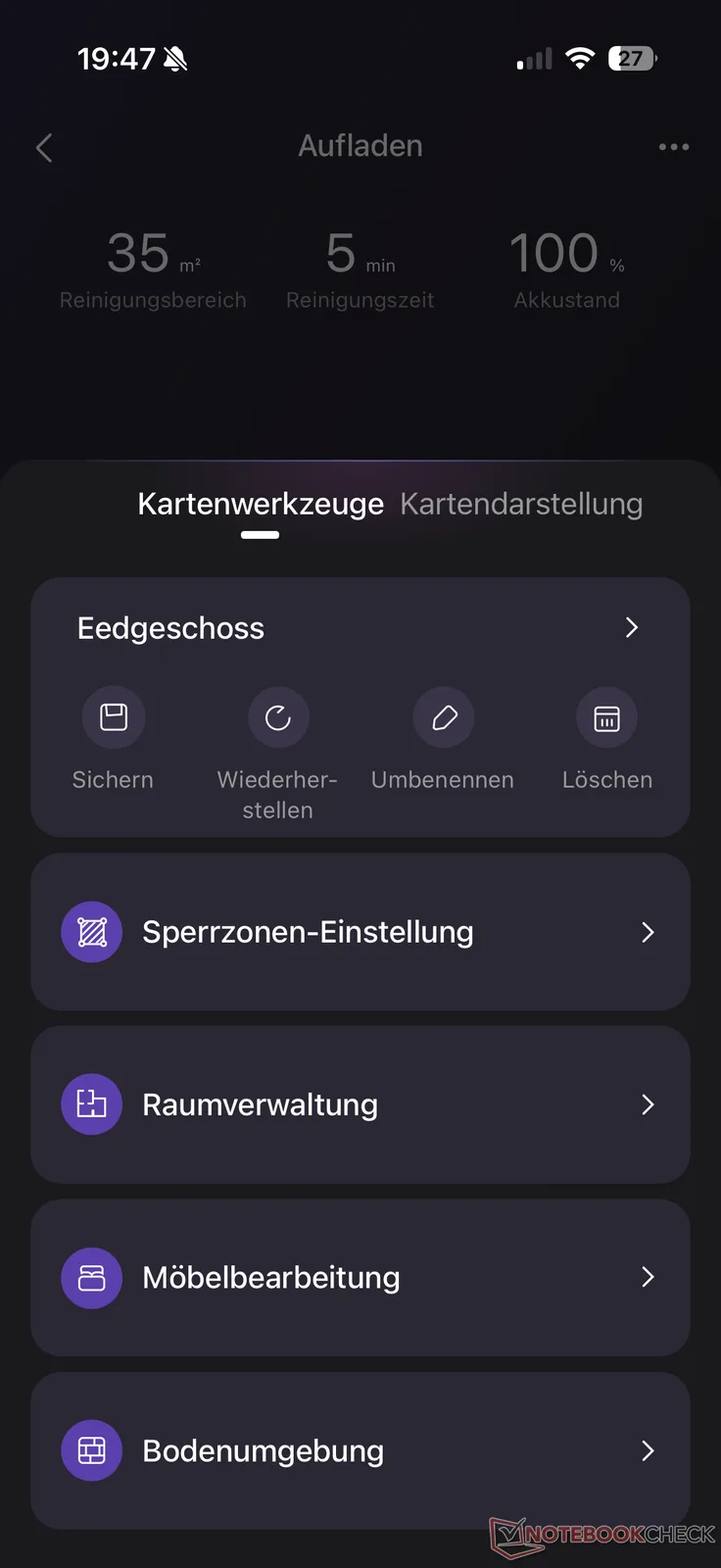 A continuación, se realiza el recorrido de mapeo habitual en todos los robots aspiradores. Aquí, la J15 Max Ultra crea un mapa virtual de su "nuevo territorio" en pocos minutos. La división automática de las habitaciones no funcionó con especial precisión. Entre otras cosas, se supuso que una ventana cerrada por una persiana era otra habitación detrás de ella basándose en el reflejo. Sin embargo, la mayoría de las imprecisiones pueden ajustarse a las condiciones reales a través de la gestión del mapa, incluidas las zonas restringidas, los umbrales, el suelo y el mobiliario. En general, sin embargo, nos gustó más la personalización del mapa con uno u otro fabricante, también gracias a los tiempos de carga de la aplicación, a veces bastante largos.