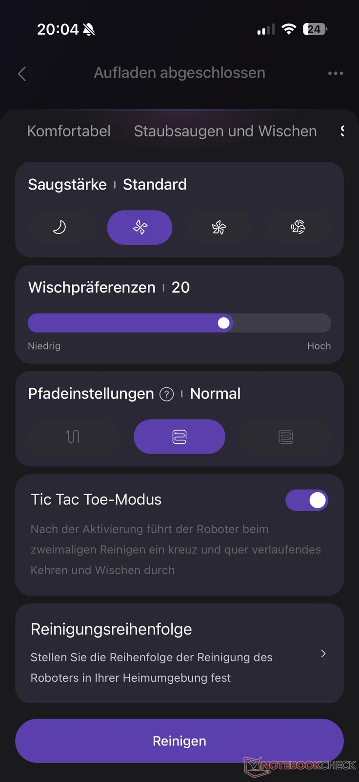 Sin embargo, Eureka no tiene nada que envidiar a los líderes del mercado en cuanto a los ajustes de limpieza disponibles. Además de los cuatro modos estándar "Aspirar y fregar", "Aspirar y luego fregar", "Fregona" y "Aspirar" para la limpieza completa, de habitaciones y zonas, también existe la opción de ajustes individuales para cada habitación, así como un modo AI con ajuste automático. La potencia de limpieza puede ajustarse en cuatro intensidades (Silenciosa, Estándar, Turbo, Máxima), la humedad de la mopa en 30 niveles y el ajuste del recorrido en tres opciones (Grueso, Normal, Fino). También puede ajustarse la secuencia de limpieza. Todo ello es estándar en los modelos de la gama alta de precios, pero importante.