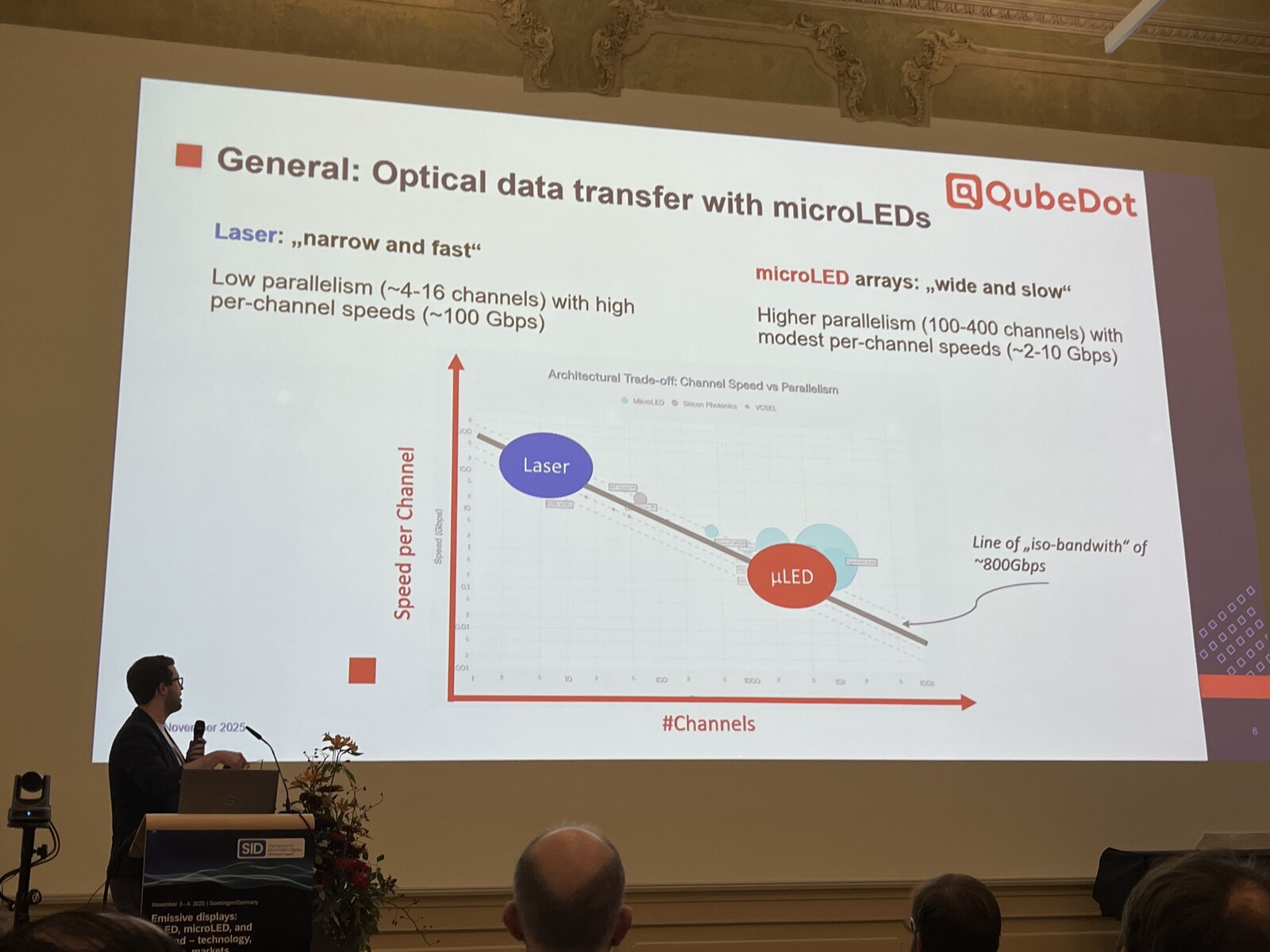 Dos de estos grupos presentaron sus trabajos en la Conferencia SID-MEC. El potencial es significativo, como demostraron las presentaciones de la empresa francesa Aledia y la alemana Qubedot. Ambas empresas se centran principalmente en las pantallas microLED, y Qubedot está especializada en píxeles únicos que pueden incluso parecerse a letras.