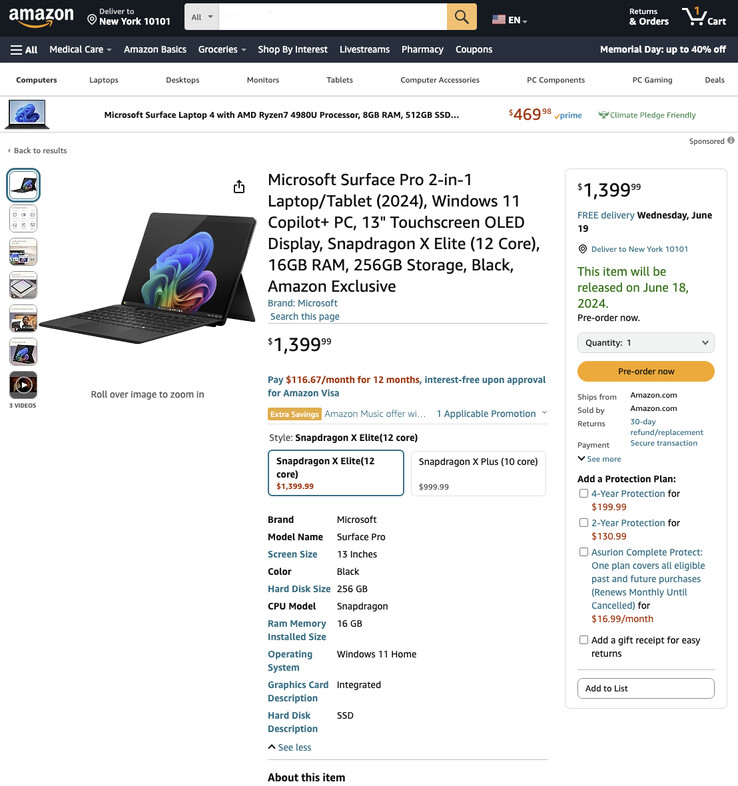 Sin embargo, resulta que Microsoft está suministrando una opción OLED más barata a Amazon, que el minorista enumera como "exclusiva de Amazon". Erróneamente, el minorista muestra la Surface Pro 11 con una Type Cover, que sigue siendo un accesorio opcional. No obstante, la SKU de Amazon rebaja la opción OLED más barata de Microsoft en 100 dólares, a pesar de no comprometerse con un chipset Snapdragon X Elite o 16 GB de RAM. En cambio, la SKU de Amazon incluye una unidad SSD de 256 GB, que sigue siendo reemplazable por el usuario, al igual que en todas las demás Surface Pro recientes. En consecuencia, Amazon es actualmente la forma más barata de adquirir una Surface Pro 11 con pantalla OLED, que saldrá a la venta el 18 de junio.