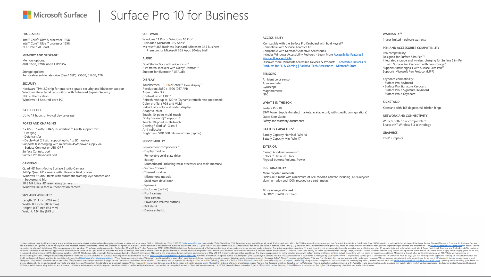 Como muestra la hoja informativa que figura a continuación, el Surface Pro 10 viene con Intel Core Ultra 5 135U o Core Ultra 7 165U ambos con una batería de 48 Wh. Además, Microsoft permitirá configurar el nuevo 2 en 1 con 8 GB, 16 GB, 32 GB o 64 GB de RAM LPDDR5x, además de 256 GB, 512 GB o 1 TB de almacenamiento PCIe Gen 4. Aunque el último Surface Pro mantiene el panel IPS de 13 pulgadas, 120 Hz y 2,8K de su predecesor con una relación de aspecto 3:2, su brillo máximo ha aumentado un 33% hasta los 600 nits, incluso con un nuevo revestimiento antirreflectante.