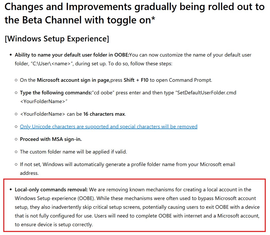 La empresa argumenta que los usuarios "se saltaban inadvertidamente pantallas de configuración críticas" al intentando eludir el proceso de inicio de sesión. Microsoft afirma que mediante la creación de una cuenta fuera de línea, los usuarios también dejan el PC "no totalmente configurado para su uso"