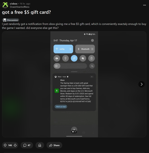La Xbox Spring Sale 2025 está en marcha con grandes descuentos en más de 1000 juegos. Aún así, puede que eso no sea suficiente para atraer a todos los compradores. Microsoft está distribuyendo códigos de tarjetas regalo por valor de 5 ó 10 dólares para dirigirse a los jugadores más frugales. Lamentablemente, a juzgar por los mensajes de en Redditlos mensajes parecen esporádicos. Los jugadores deben comprobar sus bandejas de entrada en la aplicación Xbox para PC o en la consola para ver si Microsoft ha enviado la oferta.