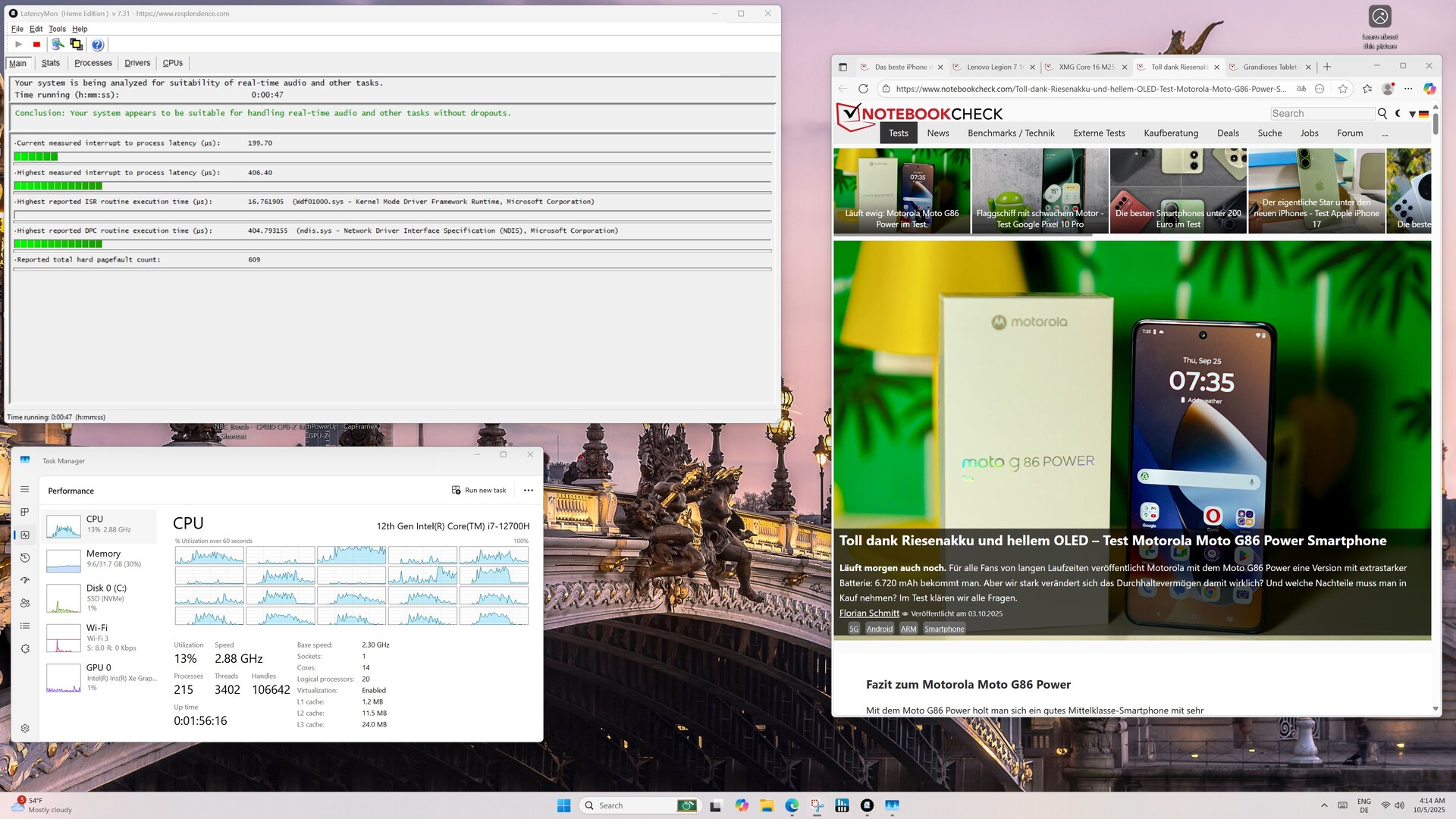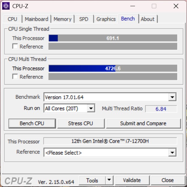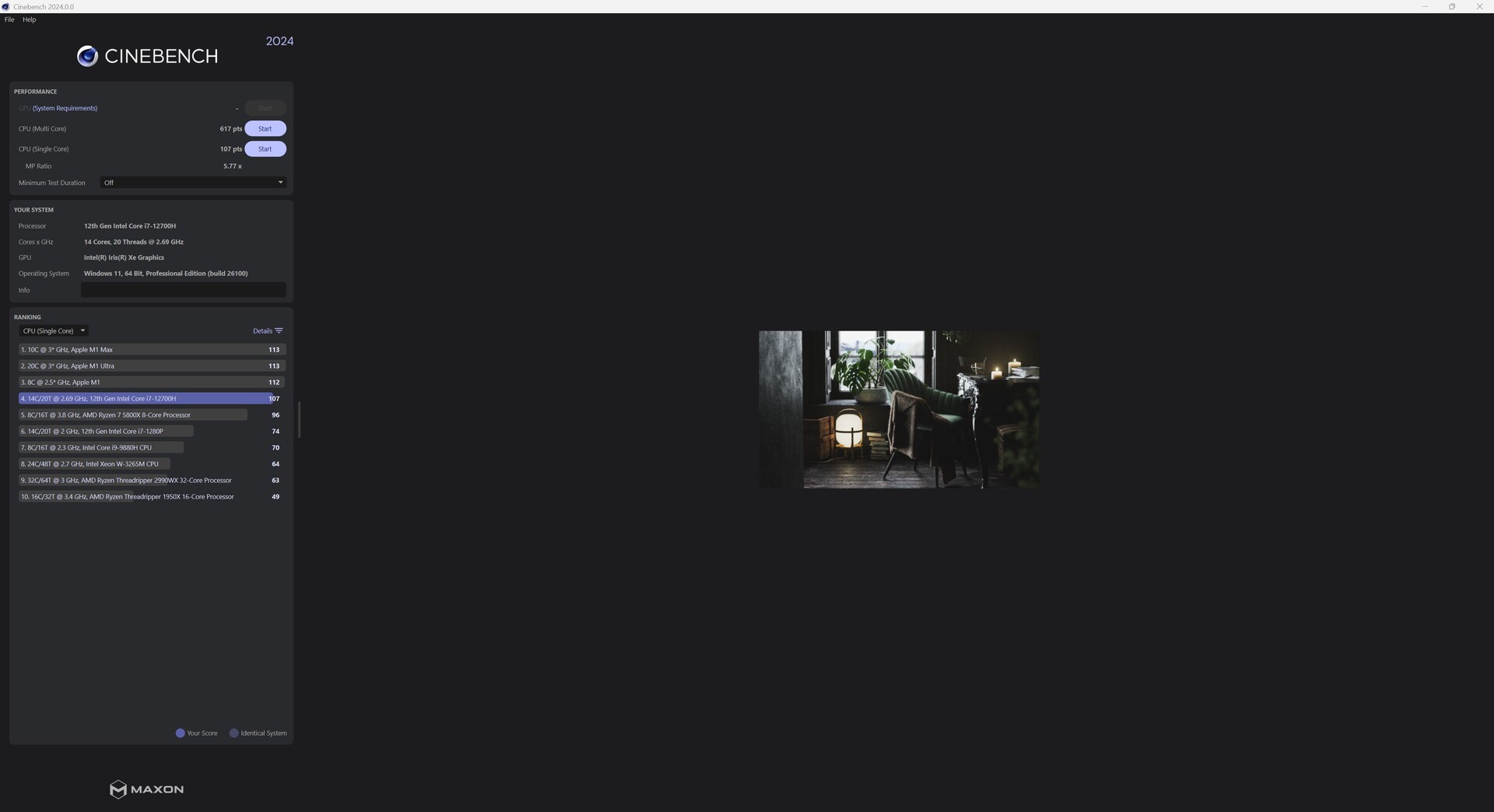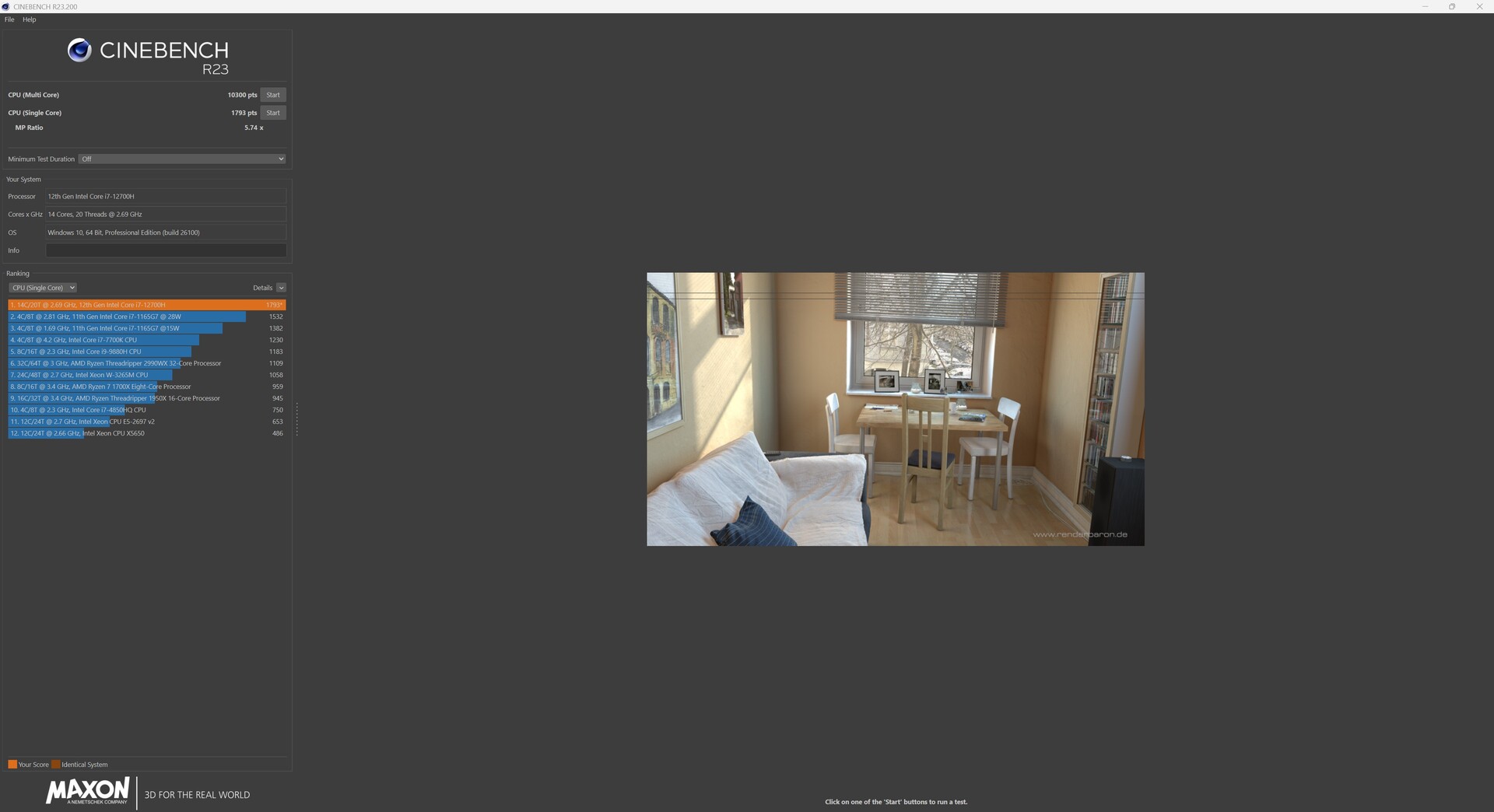 El Intel Core i7-12700H ofrece un sólido rendimiento con sus 14 núcleos (6P + 8E). En cuanto al consumo de energía, el SoC sólo funciona con 35 vatios, que es el rendimiento mínimo garantizado según las especificaciones de Intel. Esto significa que el procesador no puede seguir el ritmo de sus competidores en tareas multihilo.