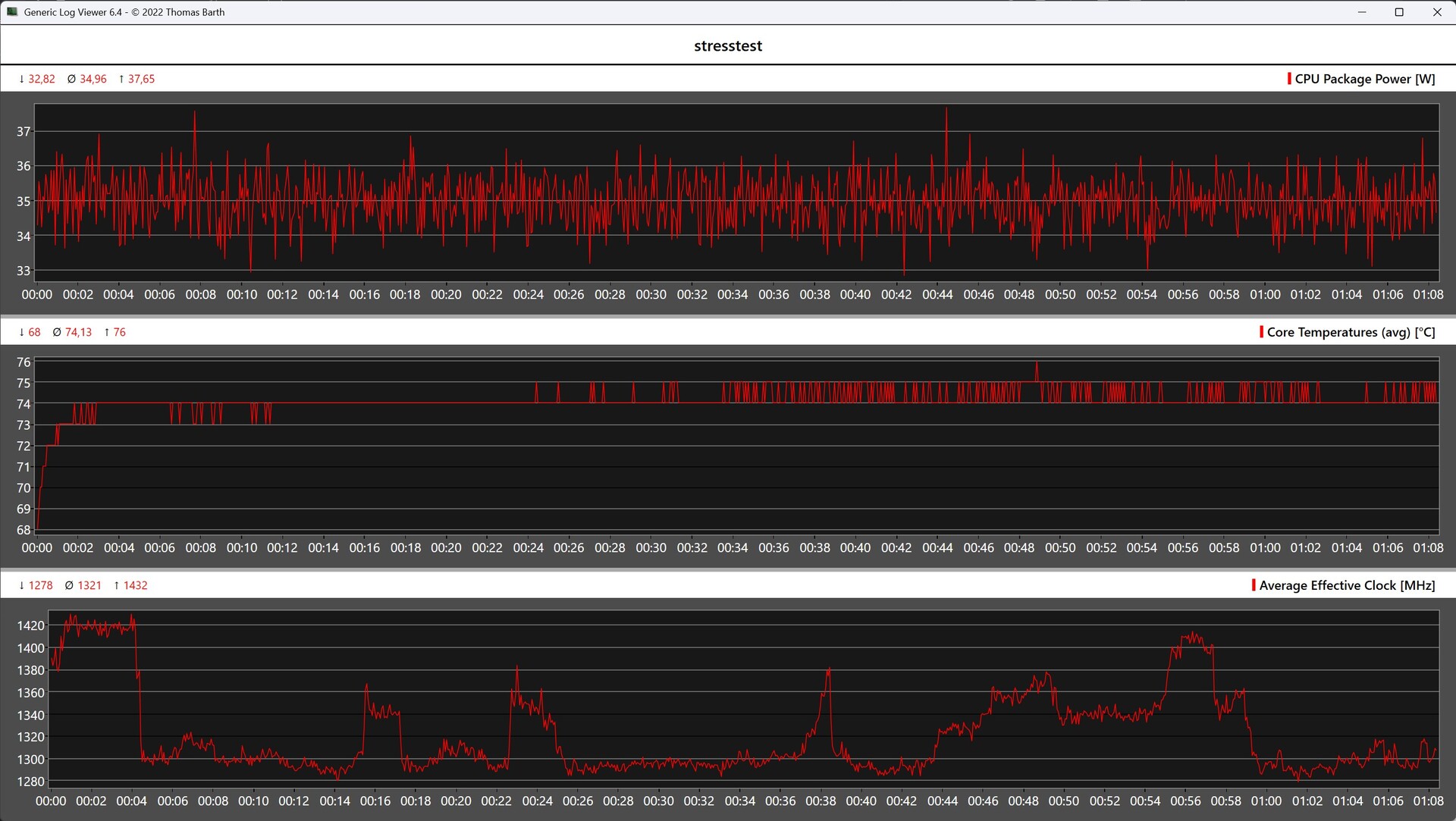 Bajo carga, la carcasa del GMKtec NucBox M3 Ultra se calienta notablemente y alcanza un valor máximo de casi 50 C en la parte inferior. En la prueba de estrés, el Intel Core i7-12700H sube inicialmente a unos 76 C y luego se estabiliza en torno a los 74 C. El consumo de energía del SoC fluctúa ligeramente entre 33 y 37 vatios, aunque se alcanza una media de 35 vatios.