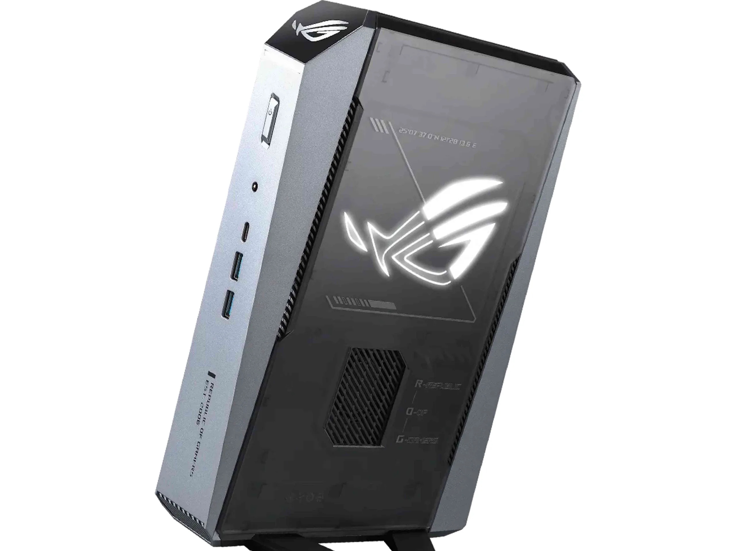 El Asus ROG GR70 no es totalmente distinto de los Modelos NUCpero su diseño visual está claramente dirigido a los jugadores. Por ejemplo, el logotipo ROG se puede ver claramente en varios lugares. A pesar de sus compactas dimensiones de sólo 282,4 × 187,7 × 56,6 milímetros, Asus instala la potente combinación de un AMD Ryzen 9 9955HX3D APU y una tarjeta dedicada Nvidia GeForce RTX 5070. Como era de esperar, Asus utiliza la versión móvil de la GPU, que viene con 8 GB de VRAM GDDR7 y consume hasta 100 vatios. Esto aumenta en 15 vatios adicionales cuando se activa Dynamic Boost.