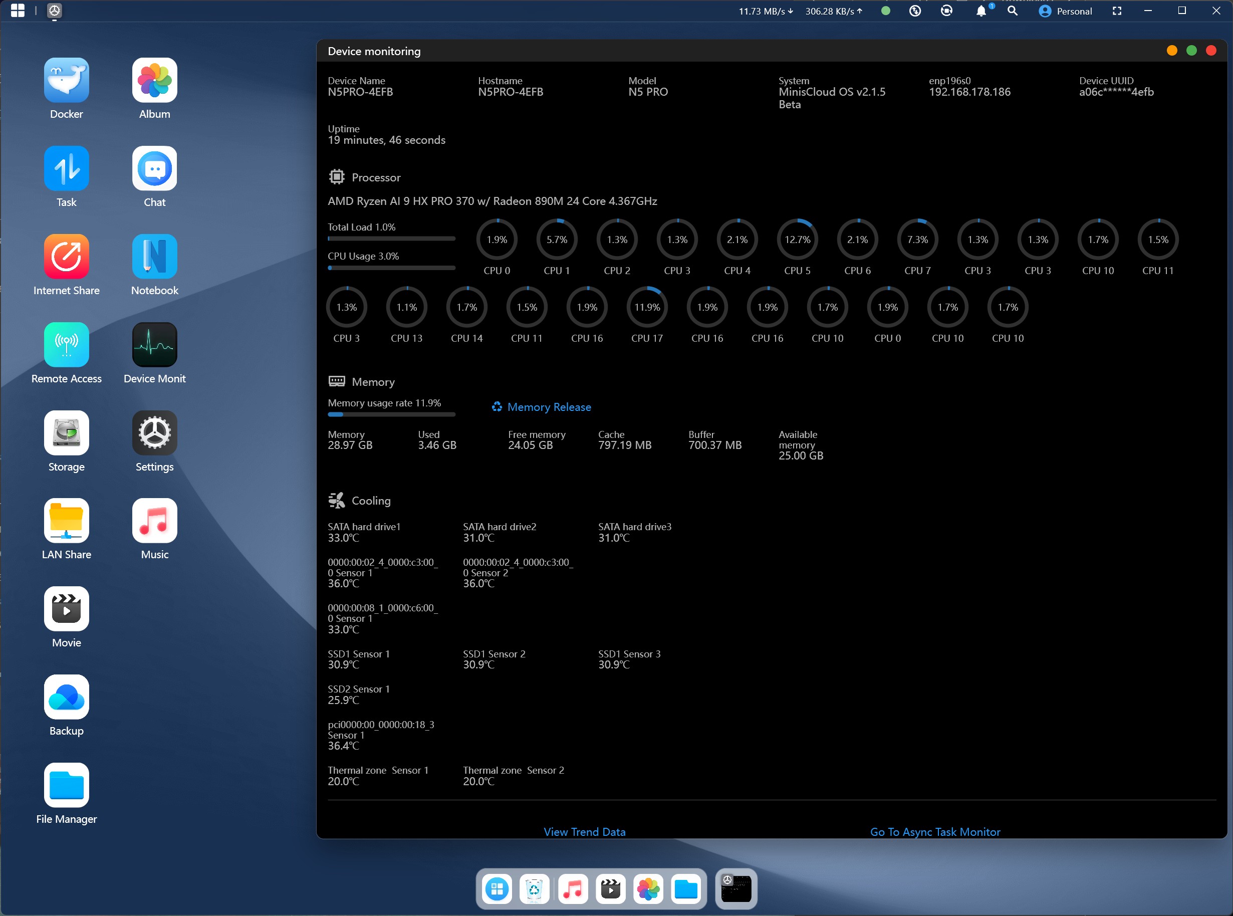El Minisforum N5 Pro se presenta como un potente y moderno NAS/miniservidor que ofrece una impresionante potencia de cálculo con el AMD Ryzen AI 9 HX PRO 370 sobre la arquitectura Zen 5. Con 12 núcleos, soporte DDR5 y gráficos Radeon 890M, el sistema es igualmente adecuado para aplicaciones multimedia, de virtualización y basadas en IA. Dos rápidos puertos LAN, una amplia gama de opciones de ampliación y un mantenimiento sencillo subrayan su nivel profesional. A pesar de su diseño compacto, el sistema de refrigeración impresiona por sus bajas temperaturas y sus moderados niveles de ruido.