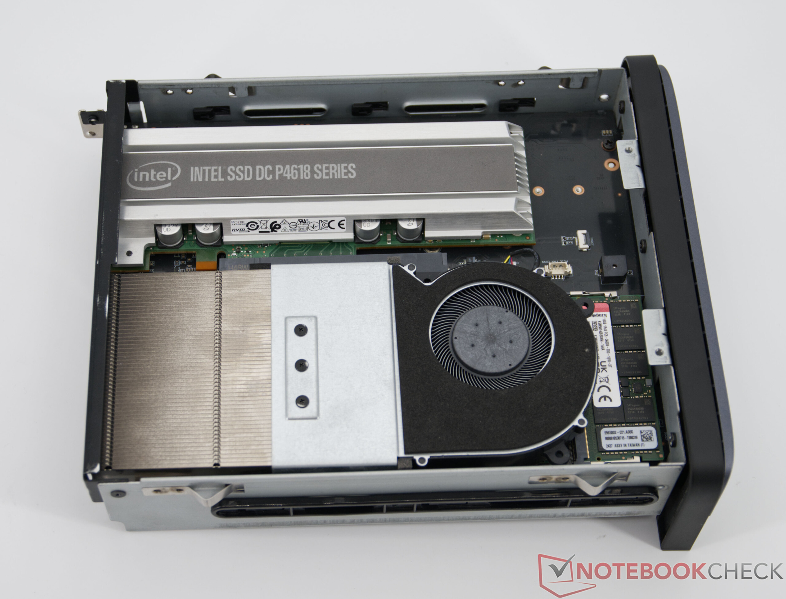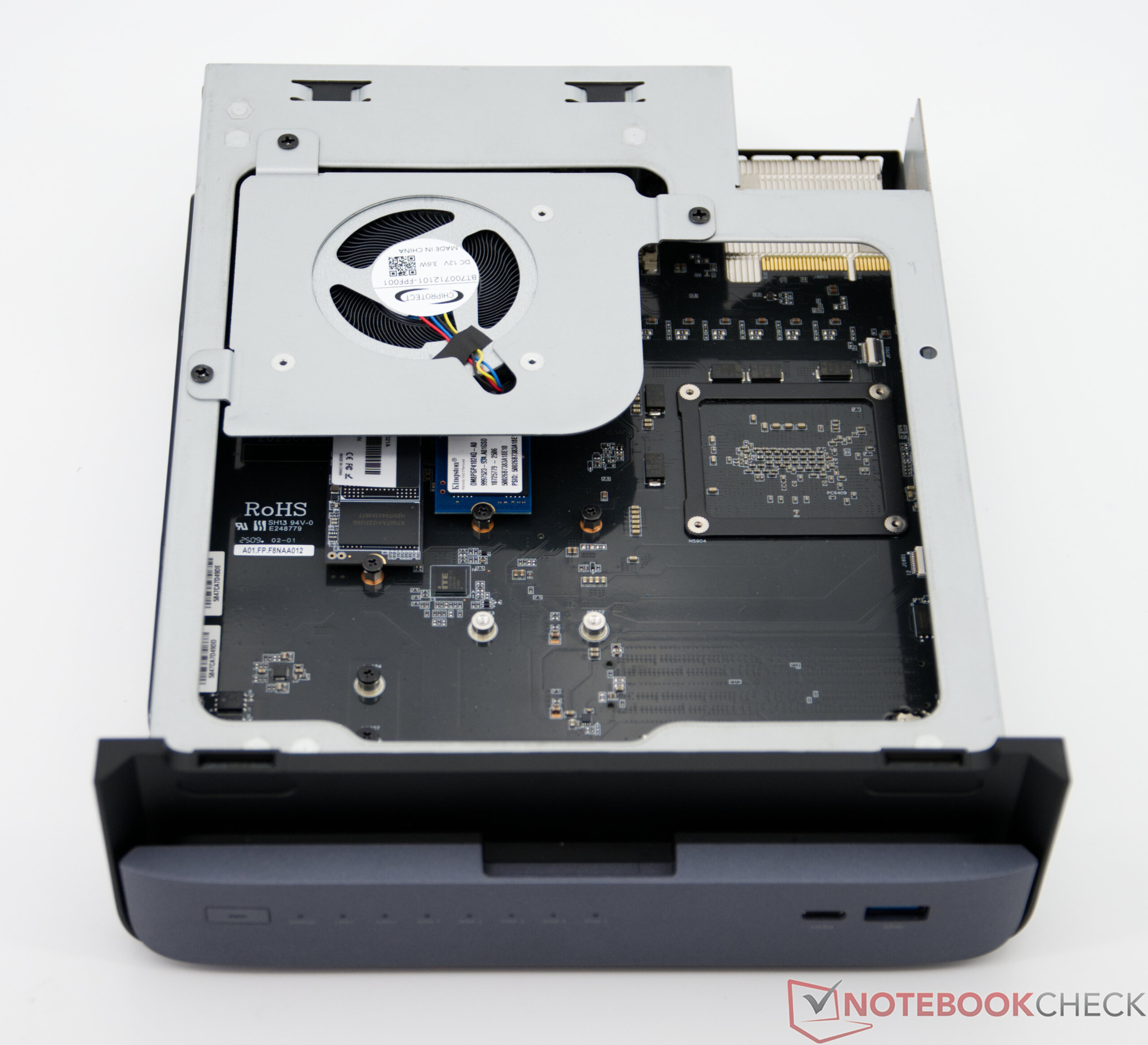Las tareas de mantenimiento del Minisforum N5 Pro son agradablemente sencillas. Las bahías de los discos duros pueden extraerse sin herramientas y montarse fácilmente. La unidad de Mini PC propiamente dicha sólo está fijada con dos tornillos y puede extraerse fácilmente después de desmontarla. Por tanto, las ampliaciones o los trabajos de limpieza también son posibles sin gran esfuerzo.