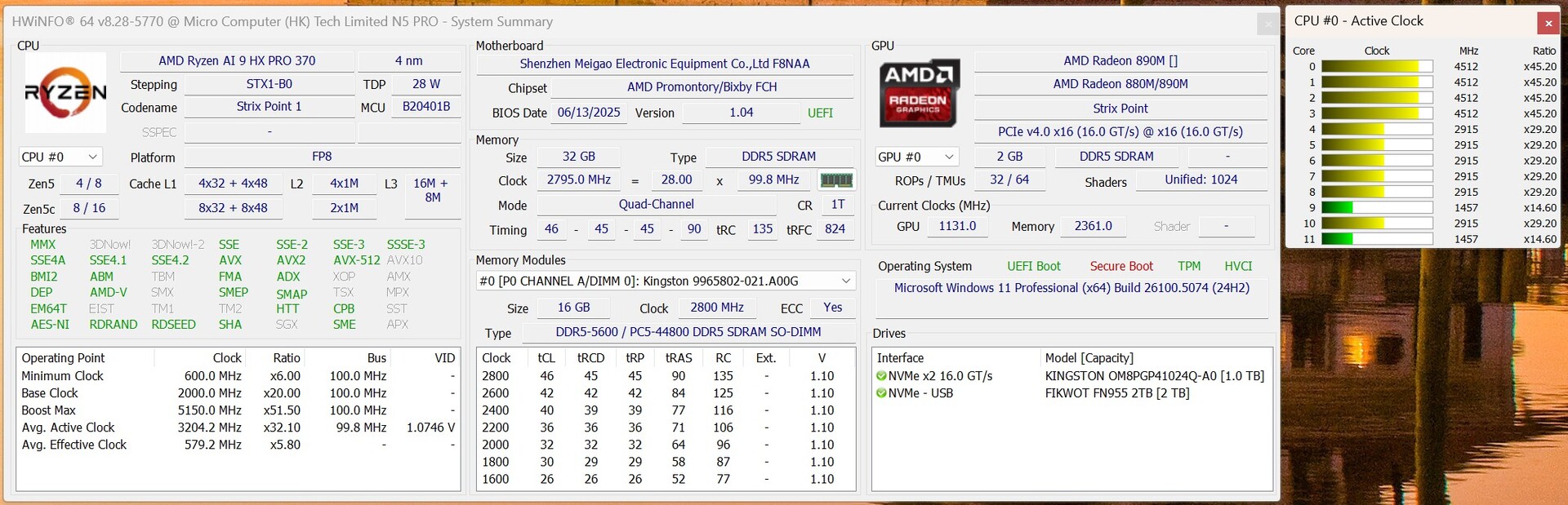 El AMD Ryzen AI 9 HX PRO 370 del Minisforum N5 Pro es un procesador de 12 núcleos de la última arquitectura Zen 5 e impresiona por su extraordinario rendimiento tanto en tareas mononúcleo como multinúcleo. Gracias a esta CPU, el NAS alcanza una potencia de cálculo excepcional que está a la altura del Intel Core Ultra 9 285H del GMKtec EVO-T1 se mueve. En una comparación directa, el NAS Minisforum N5 Pro ofrece un rendimiento superior en comparación con el Aoostar WTR Pro ofreciendo un aumento de rendimiento claramente perceptible.
