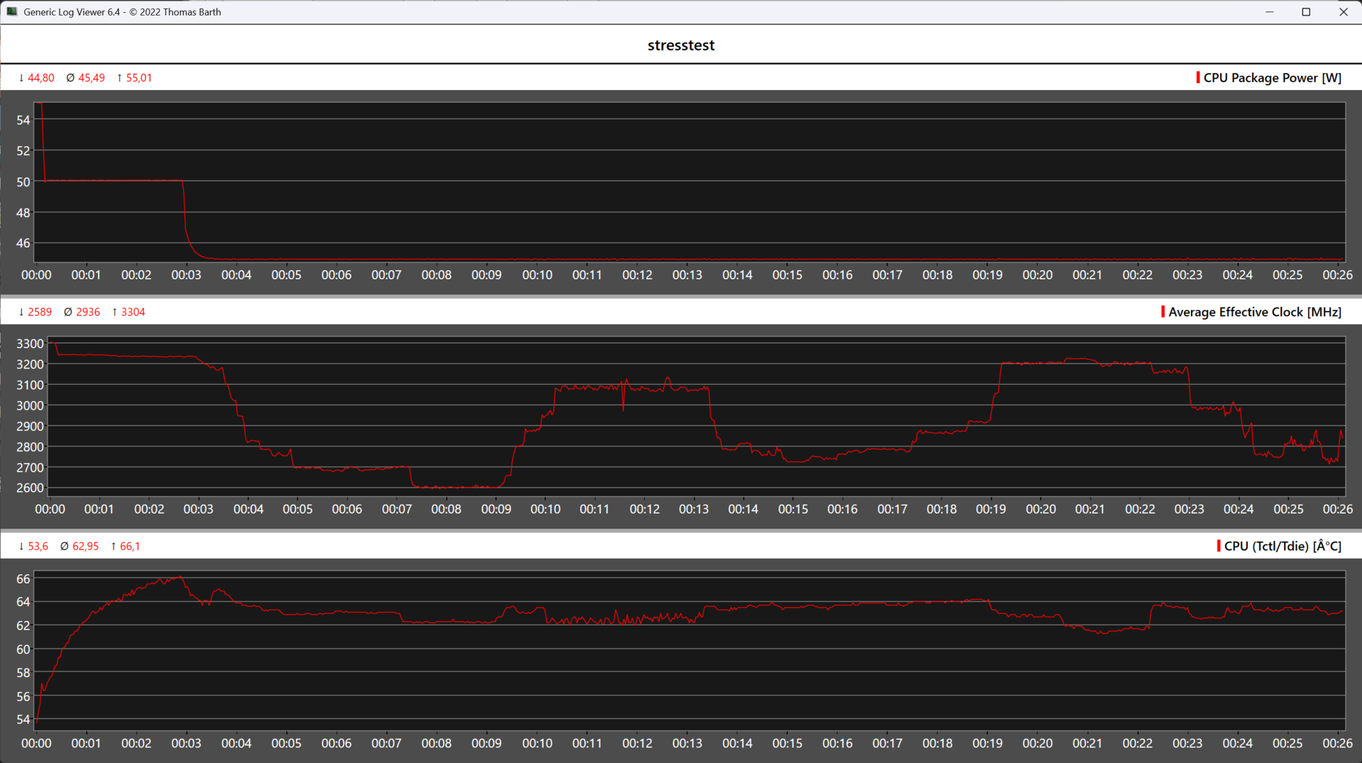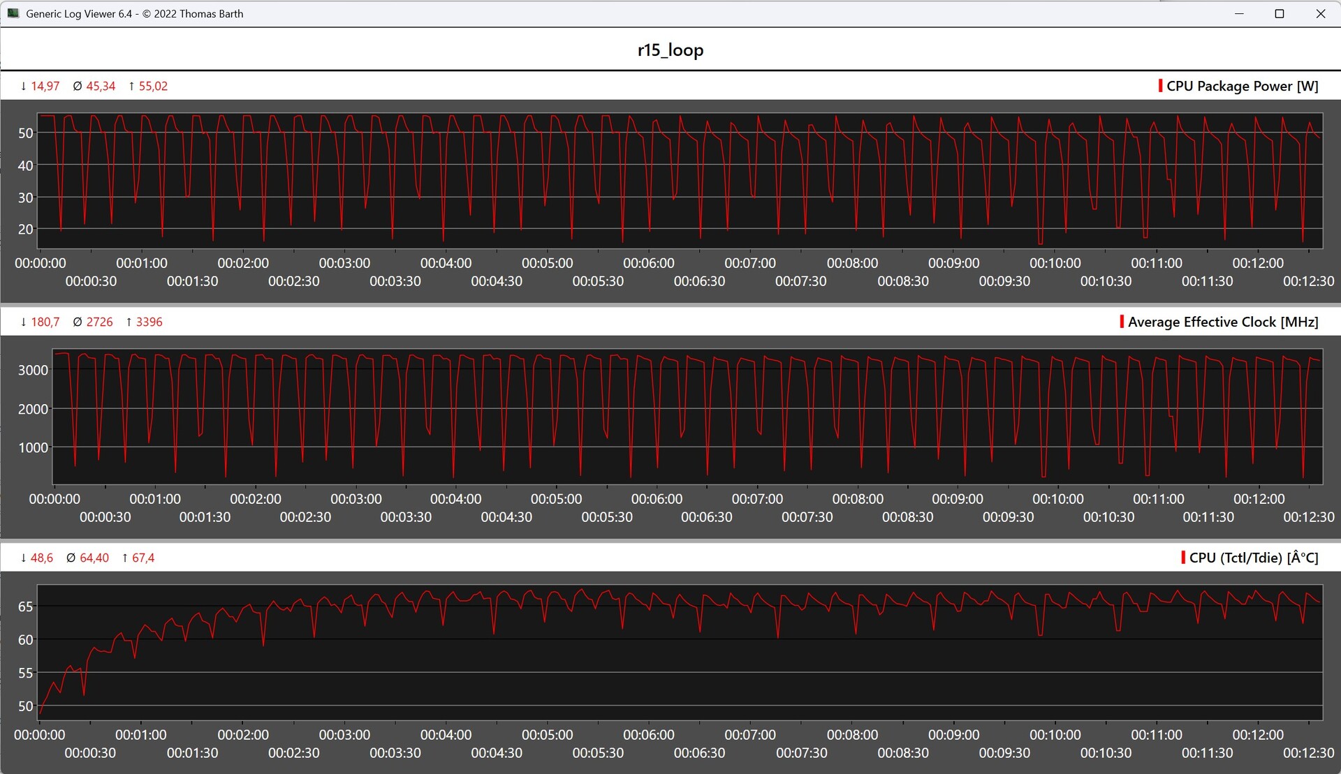 La prueba de resistencia Cinebench R15 indica que el sistema de refrigeración del Minisforum N5 Pro es compacto pero extremadamente eficiente. Incluso a plena carga continua, no se aprecia ninguna pérdida de rendimiento. El AMD Ryzen AI 9 HX PRO 370 alcanza picos de rendimiento de hasta 55 vatios, mientras que el rendimiento continuo se estabiliza en torno a los 45 vatios. La temperatura máxima se mantiene agradablemente baja en torno a los 67,4 C.